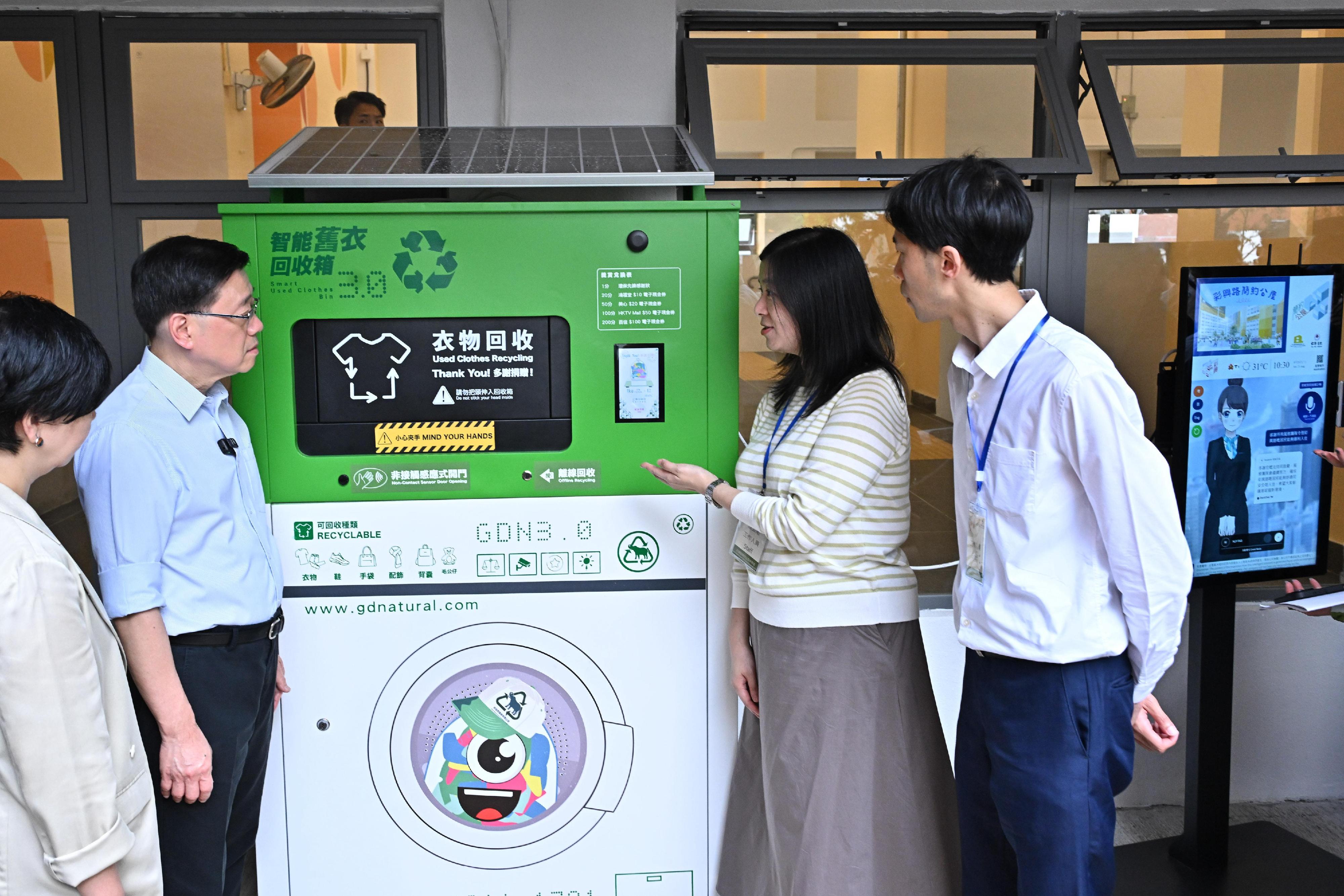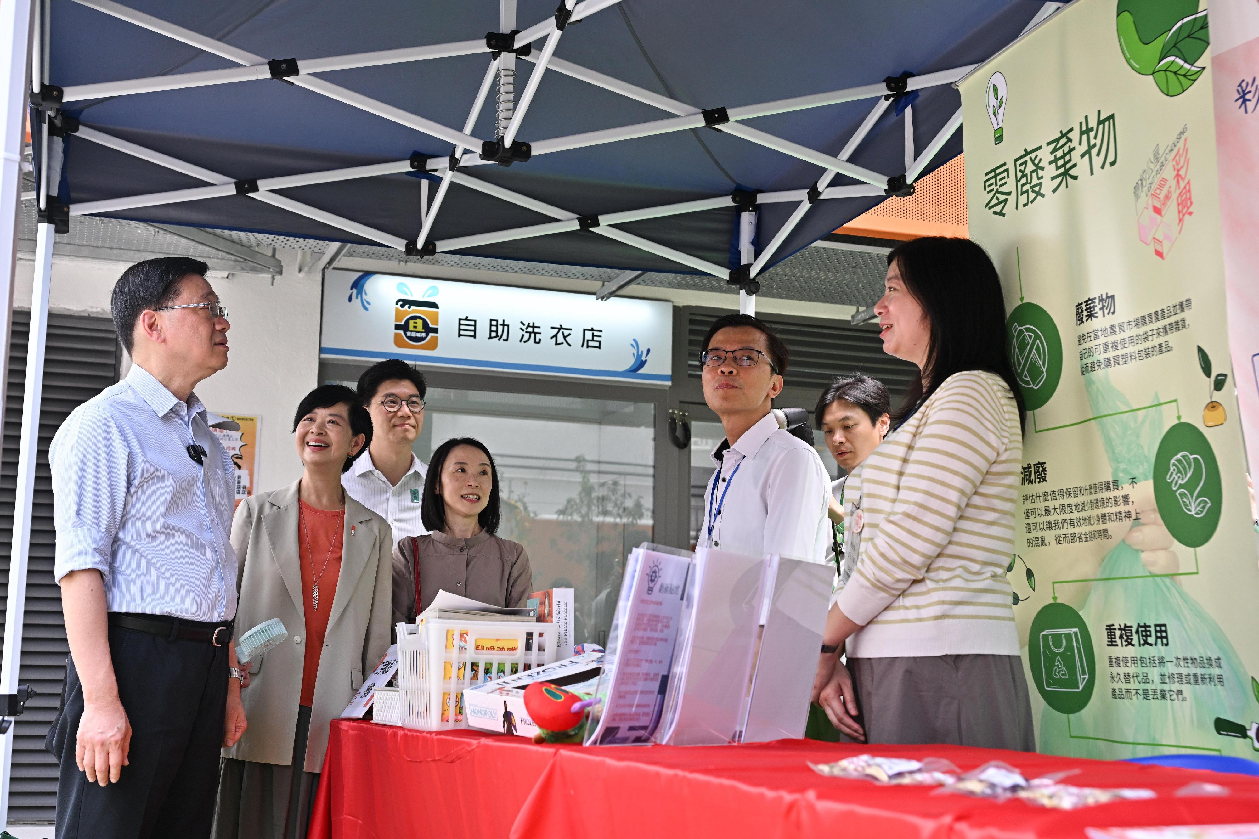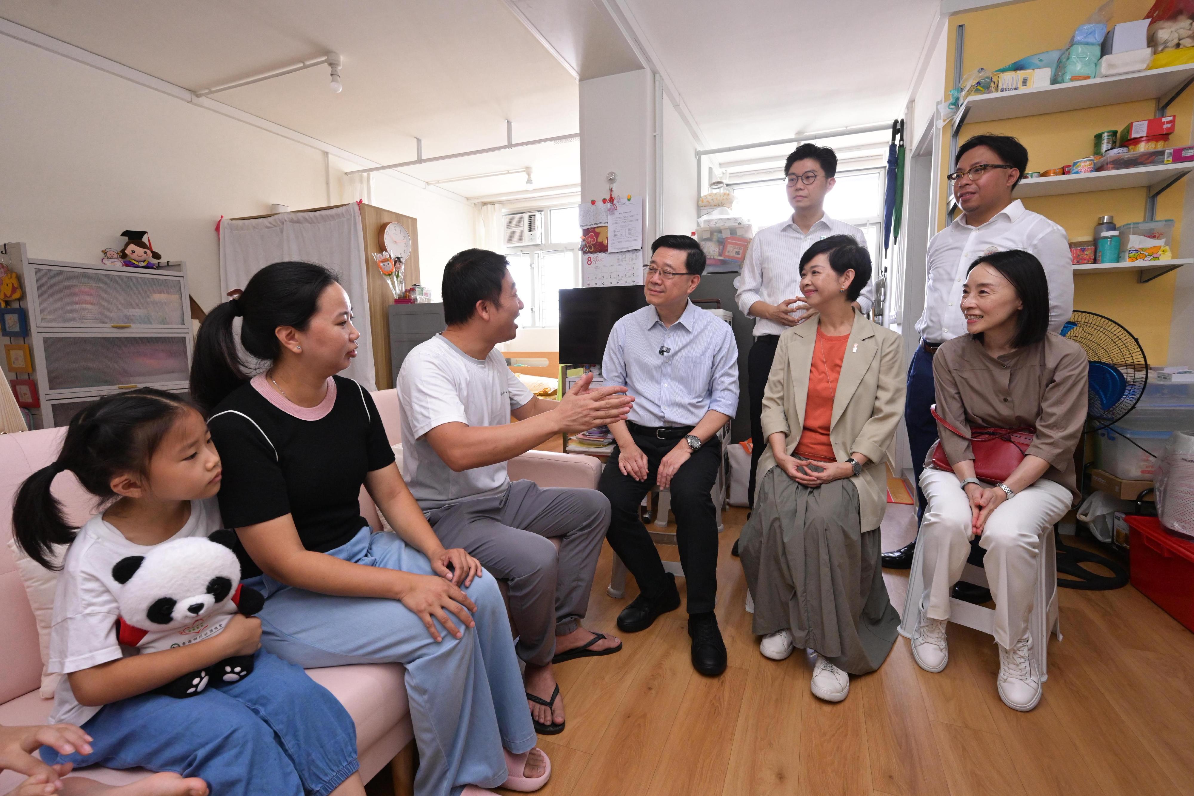 李家超一行在觀塘民政事務專員何立基陪同下先到訪彩興路「簡約公屋」項目,了解營運情況和入伙進度。他探訪一戶已入伙居民,聽取其分享入住前後的生活轉變;並與一戶剛完成入伙手續的居民參觀新居。他亦參觀項目設施,了解物業管理的科技運用和附近交通配套,又參觀正在舉行的周末市集攤位,與不同居民交流,聽取施政意見。