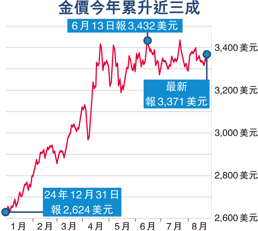 另一方面,美聯儲減息可能性加強之下,美元上周五下跌,美匯指數跌0.9%至97.7。基於美元下跌,現貨金一度逼近每盎司3,380美元,收市報3,371.67美元,升幅約1%。紐約期金收市報每盎司3,418.5美元,升幅近1.1%。