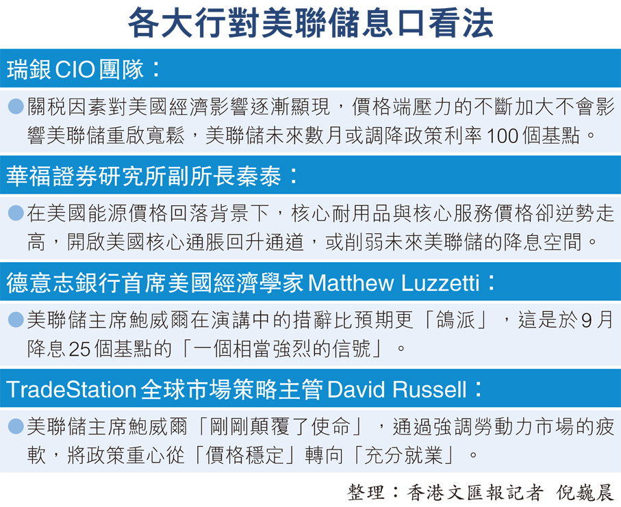 「美國本輪『關稅通脹』的衝擊或會更慢、更久。」招商證券首席宏觀分析師張靜靜提醒,鮑威爾在Jackson Hole全球央行會議上的表態也暗示了這一點,相信美聯儲前期或適度「搶減息」,但後期減息門檻將逐步上升。她強調,美聯儲政策框架的調整,更多針對中期變化,未來其對通脹上行的容忍度或明顯高於就業下行,惟回歸低利率時代難度較高。本月美國通脹和就業數據若如期呈現鮑威爾所預期的組合,特別是就業的適度走軟,「9月減息25個基點即是合理幅度」。
