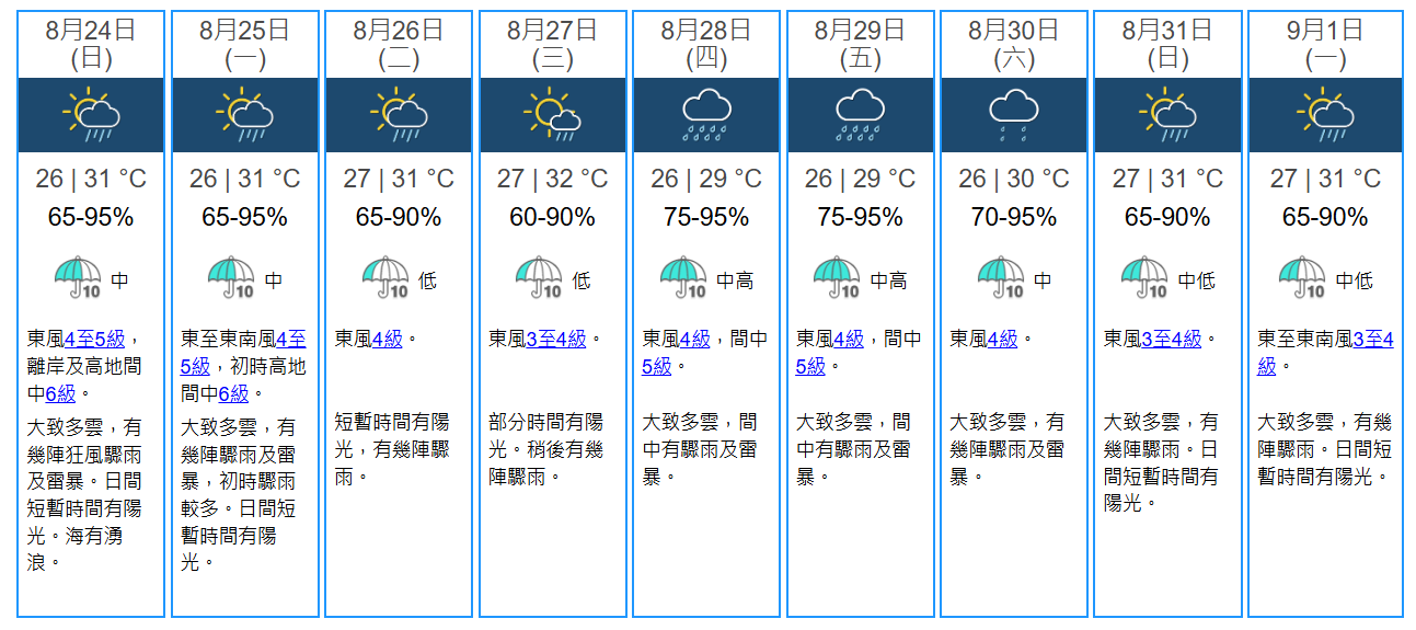 天文台預料今日大致多雲,有幾陣狂風驟雨及雷暴,日間短暫時間有陽光。未來兩三日風勢逐漸緩和,短暫時間有陽光,仍有幾陣驟雨。