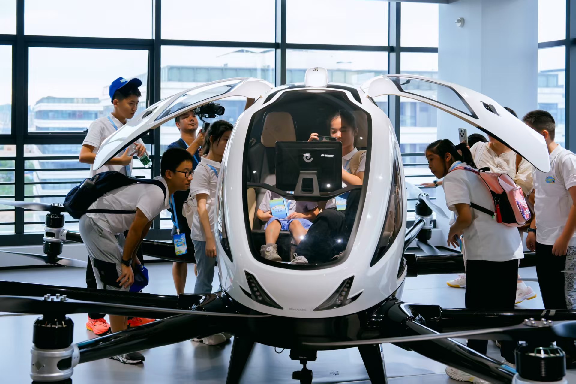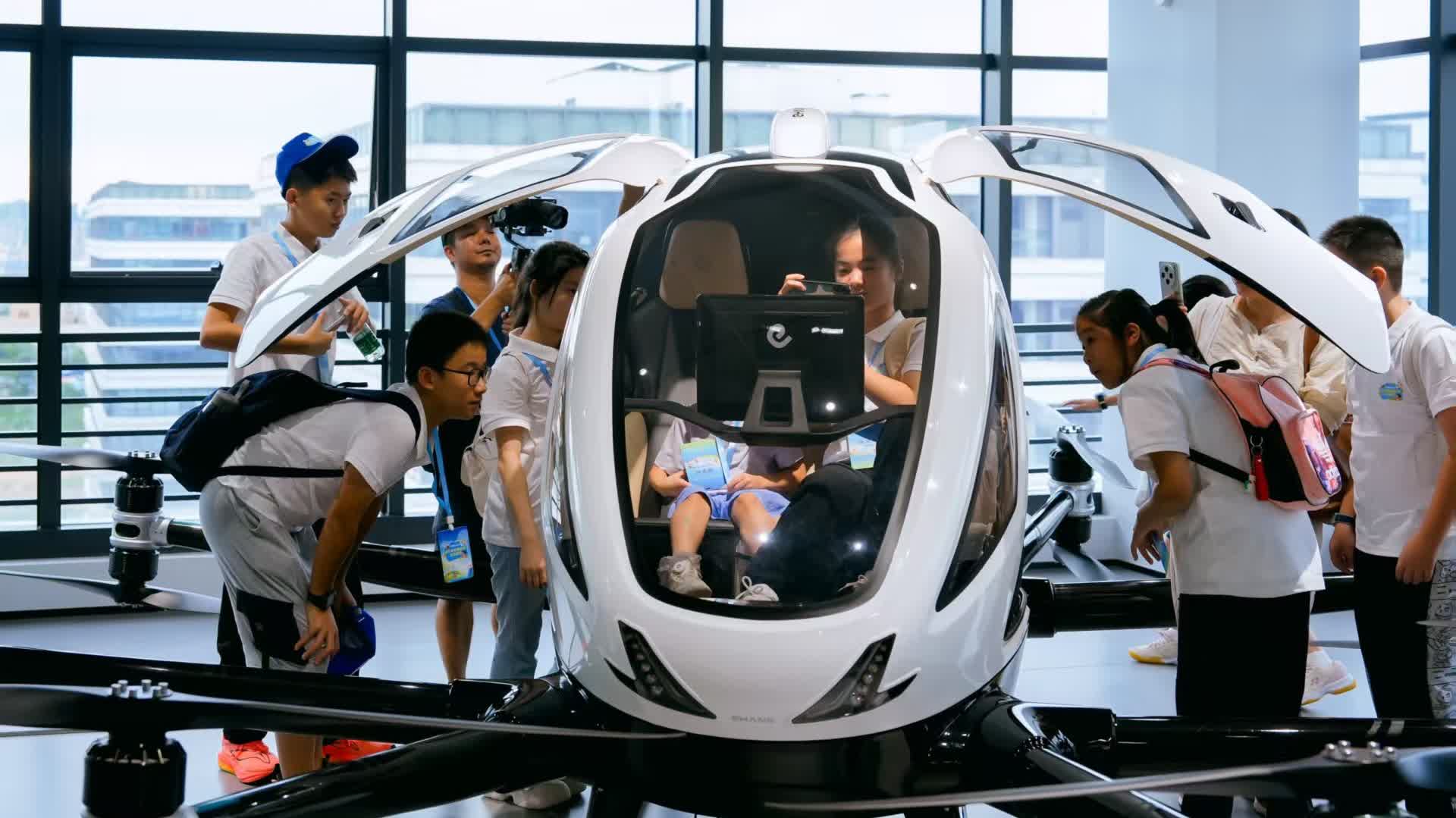 在廣州億航智能,孩子們坐進無人駕駛載人航空器,這是一種不需要飛行員的載人垂直起降航空器。孩子們好奇的同時亦「腦洞大開」,無人機「可不可以把外賣送到天界」、「能不能幫我搬家」?一系列發問引發無人機未來應用的新遐想。