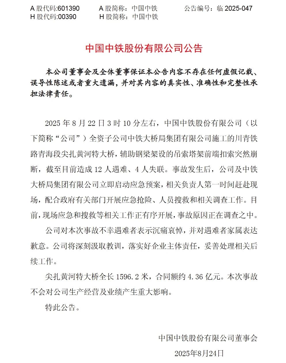 尖扎黃河特大橋全長1596.2米,合同額約4.36億元。本次事故不會對中國中鐵生產經營及業績產生重大影響。