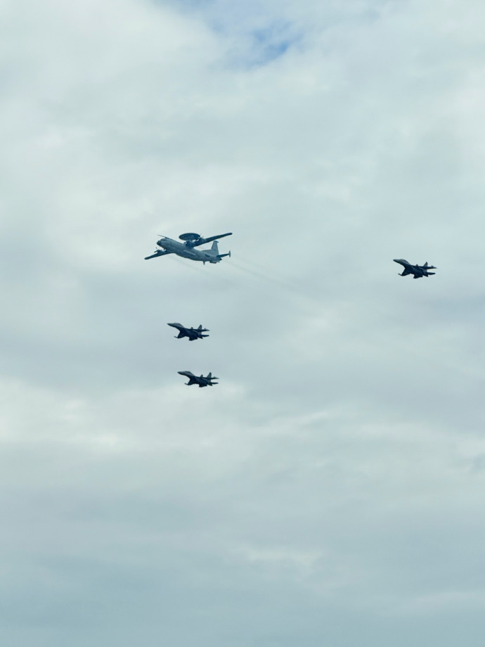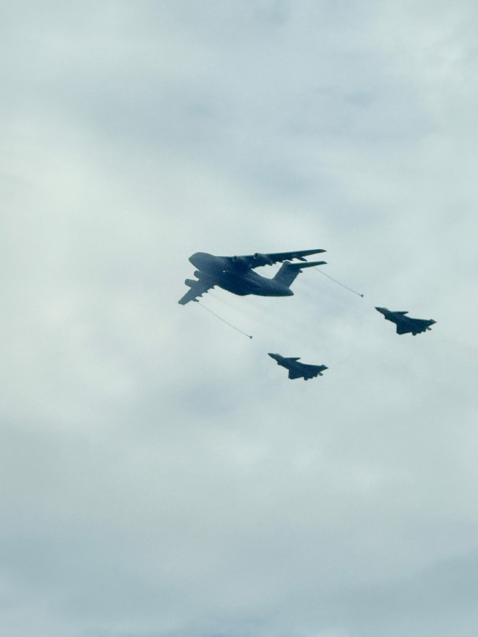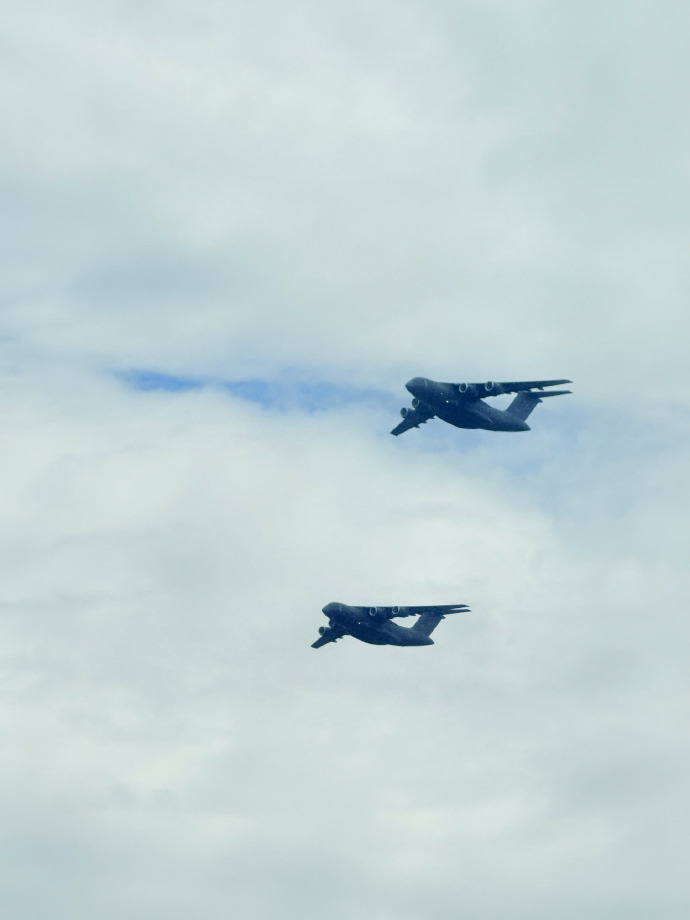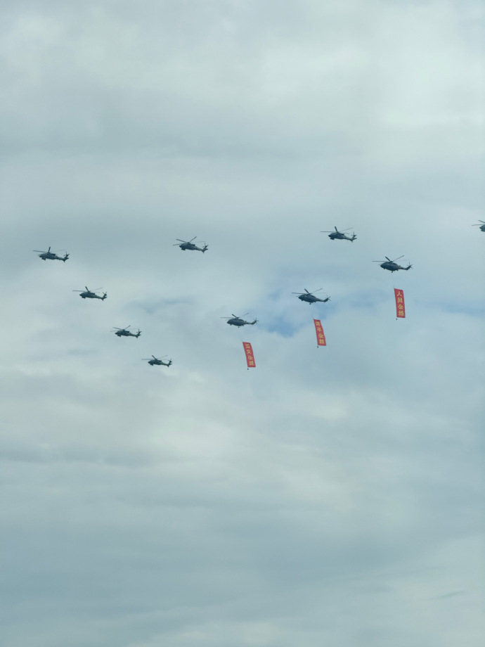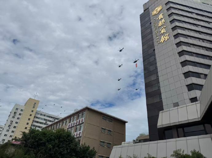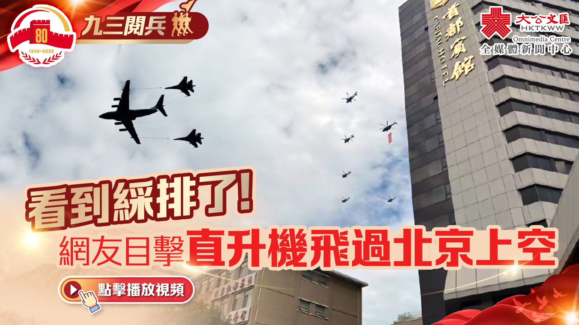 大公文匯全媒體報道,今日(24日)距離紀念中國人民抗日戰爭暨世界反法西斯戰爭勝利80周年閱兵活動還有10天。有身處北京的網友目擊閱兵綵排,拍到直升機、運輸機等飛過北京上空,更目睹加油機展示低空加油。