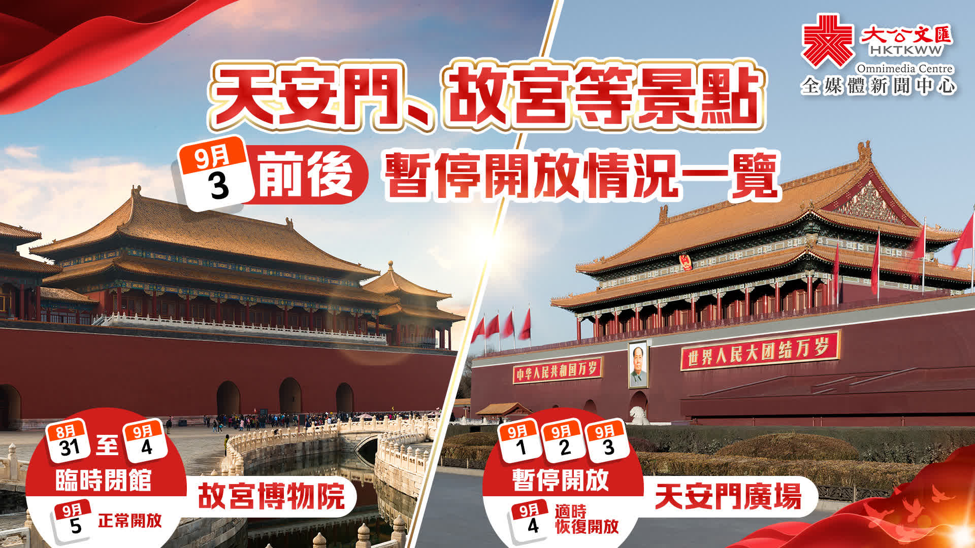 另據故宮博物院8月24日公告,為配合天安門地區活動安排,故宮博物院將於8月31日至9月4日臨時閉館,9月5日正常開放。請您合理安排參觀計劃,給您帶來不便,敬請諒解。如需幫助,可撥打服務熱線:400-950-1925。