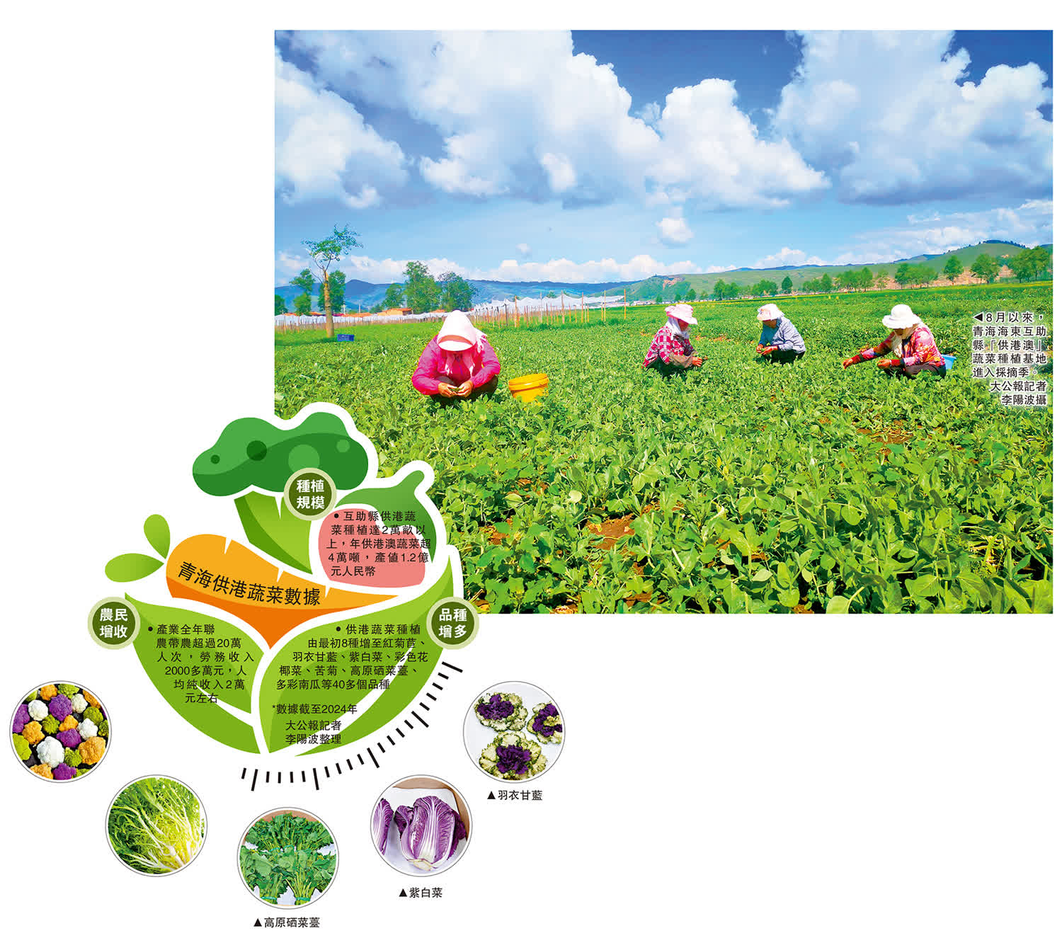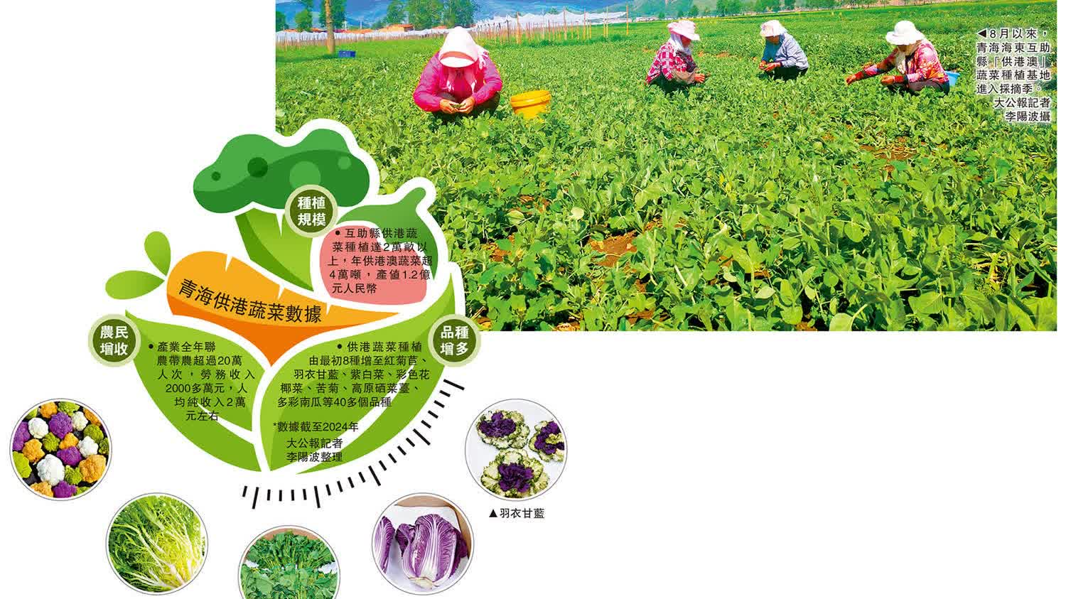 青海冷涼蔬菜與香港結緣於2019年,當年,互助縣推出「供港澳」冷涼蔬菜基地,至2023年率先實現出境,從2600米的海拔跨越2000公里進入香港。去年,互助縣30餘種高原冷涼蔬菜亮相青海─香港經貿交流合作推介會,反響熱烈,拓寬進入香港市場渠道。目前,互助縣供港蔬菜種植增至40多個品種,去年供應港澳逾4萬噸,產值1.2億元(人民幣,下同)。