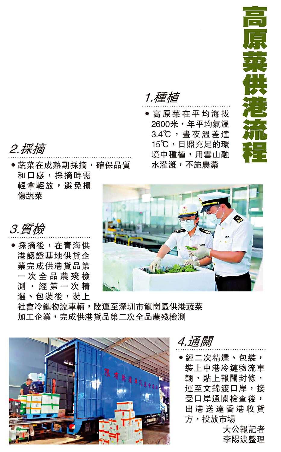 (大公報記者 李陽波、易曉彤)「守護香港菜籃子,實現訂單式生產,香港市民喜愛什麼就種植什麼。」盛夏8月,海拔2600米的青藏高原東北部青海省互助縣「供港澳」蔬菜種植基地一片忙碌,採摘、分揀、裝箱,以雪山融水「孕育」的高原冷涼蔬菜通過200餘項安全檢測後,最快24小時跨越逾2000公里直上港人餐桌,體現中央對港關愛。