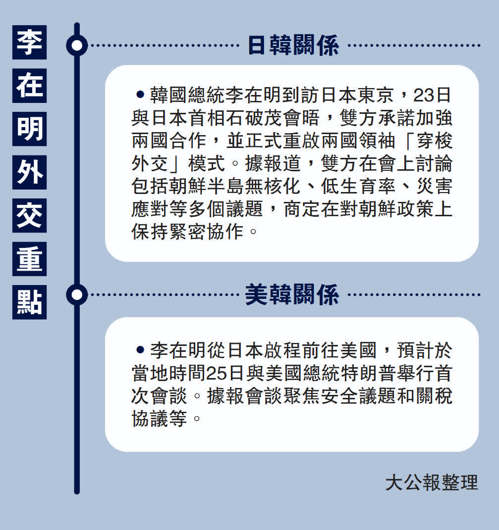 大公報綜合報道,韓國總統李在明24日結束為期兩天的訪日行程,啟程前往華盛頓特區,將於當地時間25日首次與美國總統特朗普舉行首腦會談。韓媒指,李在明將面臨關鍵的外交政策考驗,核心議題將涉及關稅和安全問題。美方或要求韓國拿出關稅協議中對美3500億美元投資基金的具體計劃。另外,李在明打破慣例先訪日、再訪美,也有向日本首相石破茂就如何與特朗普打交道「取經」之意。