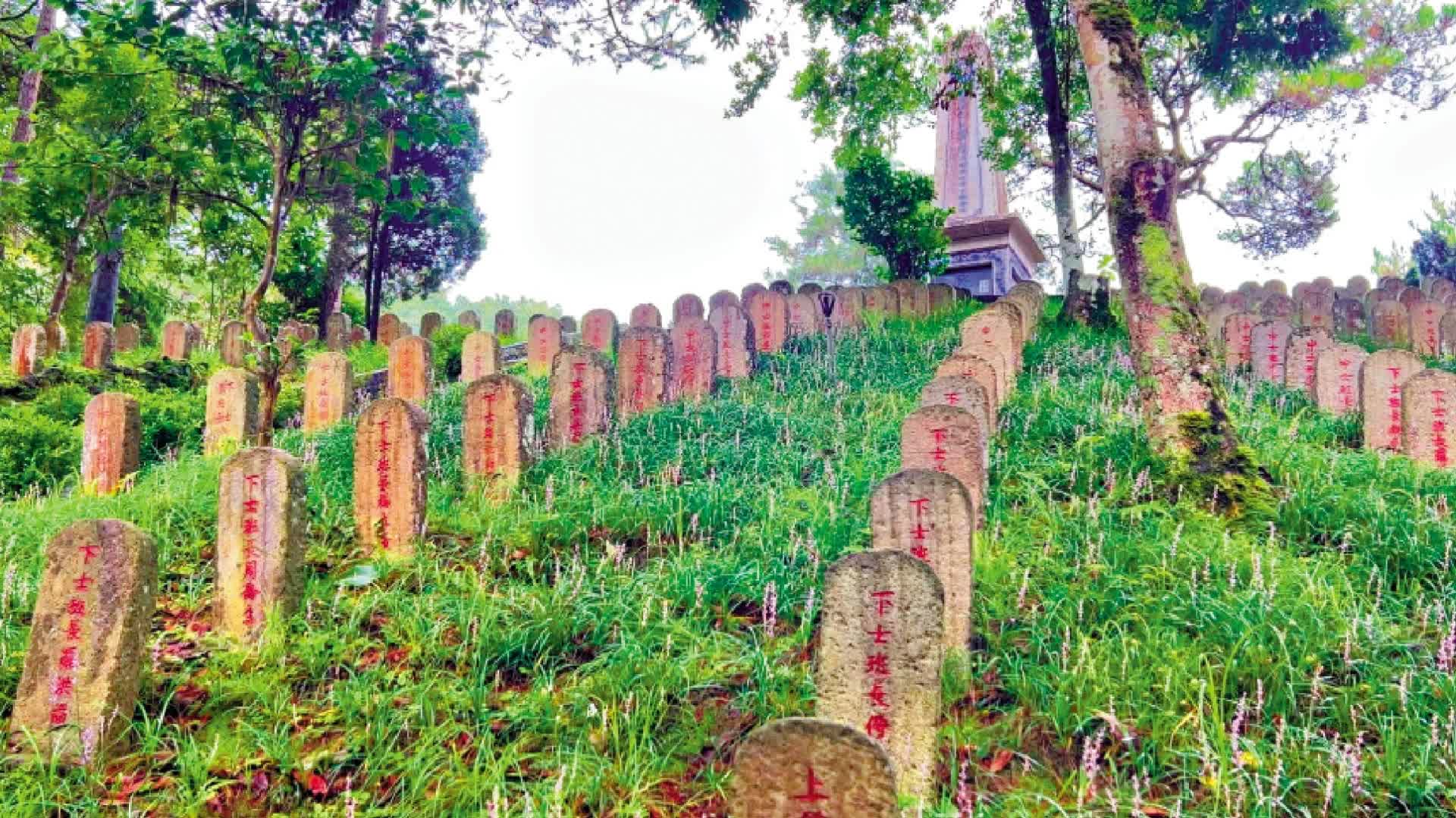 位於忠烈祠後的小團坡尤為震撼,布滿墓碑的圓錐形小山坡上,3346座墓碑,依作戰序列整齊排列,宛如一支隨時待命出征的軍隊。墓碑下,是將士們的骨灰,雖歷經歲月,卻依舊散發着堅毅的氣息。山頂的陣亡將士紀念塔,似一把利劍直插雲霄,象徵着民族不屈的精神。