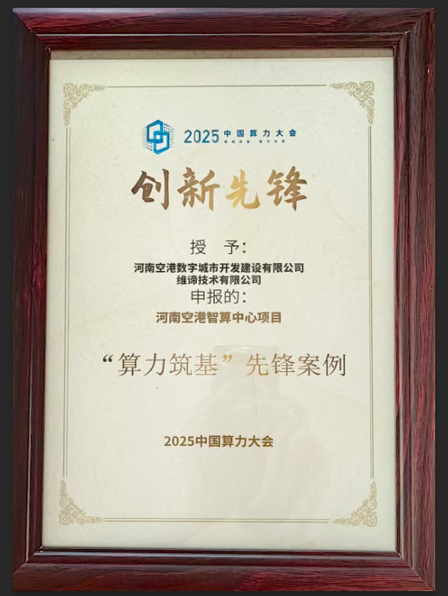 在當日揭曉的「創新先鋒」優秀案例評選中,由河南空港數字城市開發建設有限公司牽頭,聯合維諦技術有限公司申報的「河南空港智算中心項目」成功入選,成為中國算力基礎設施建設的標桿案例!這一成果不僅標誌着中原地區在算力基礎設施建設領域實現跨越式突破,更以創新實踐為全國新型算力網絡構建提供了"中原方案"。