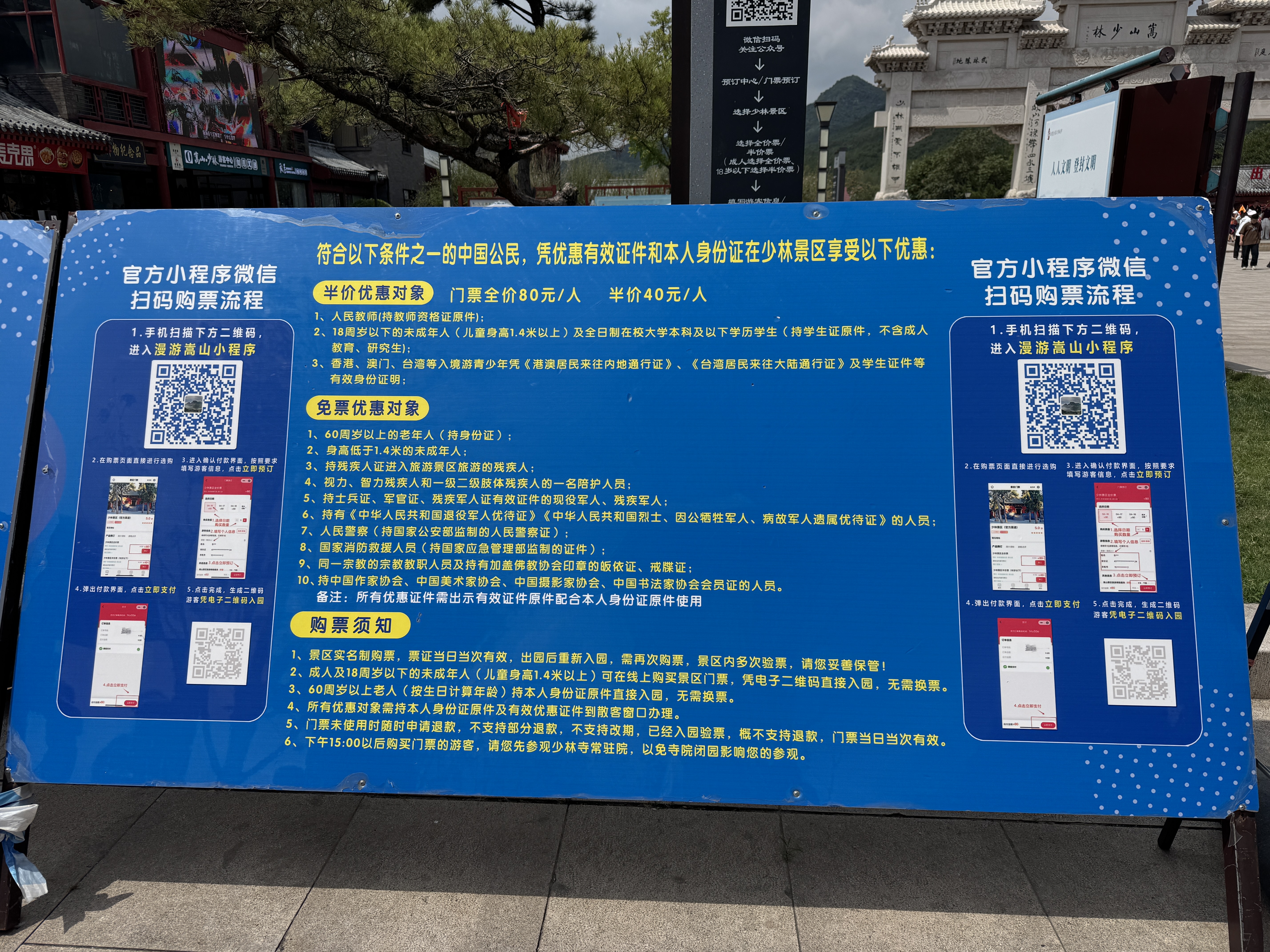 抵達少林寺景區入口,售票處的電子屏清晰顯示着票價信息:成人票80元人民幣,與此前無異。現場工作人員告訴記者,目前線上線下購票渠道均正常開放,遊客可自由選擇。這與早前的政策調整形成對比——7月27日,少林寺官方通報,釋永信涉刑事犯罪被查。在釋永信被傳接受調查期間,少林寺曾緊急通知改為線上預約購票,然而僅一天後便恢復原有購票渠道,政策的快速更迭曾引發外界熱議。