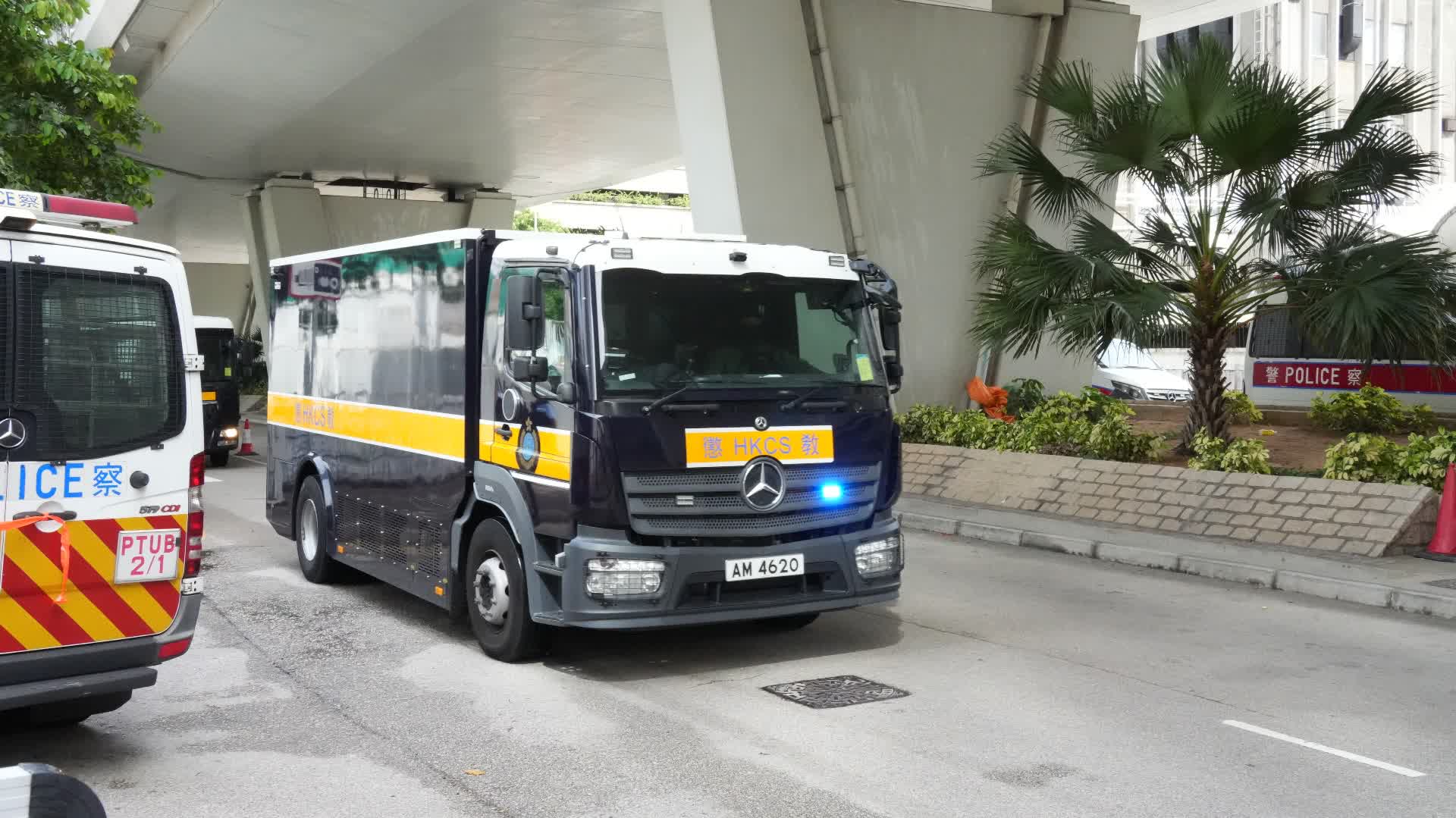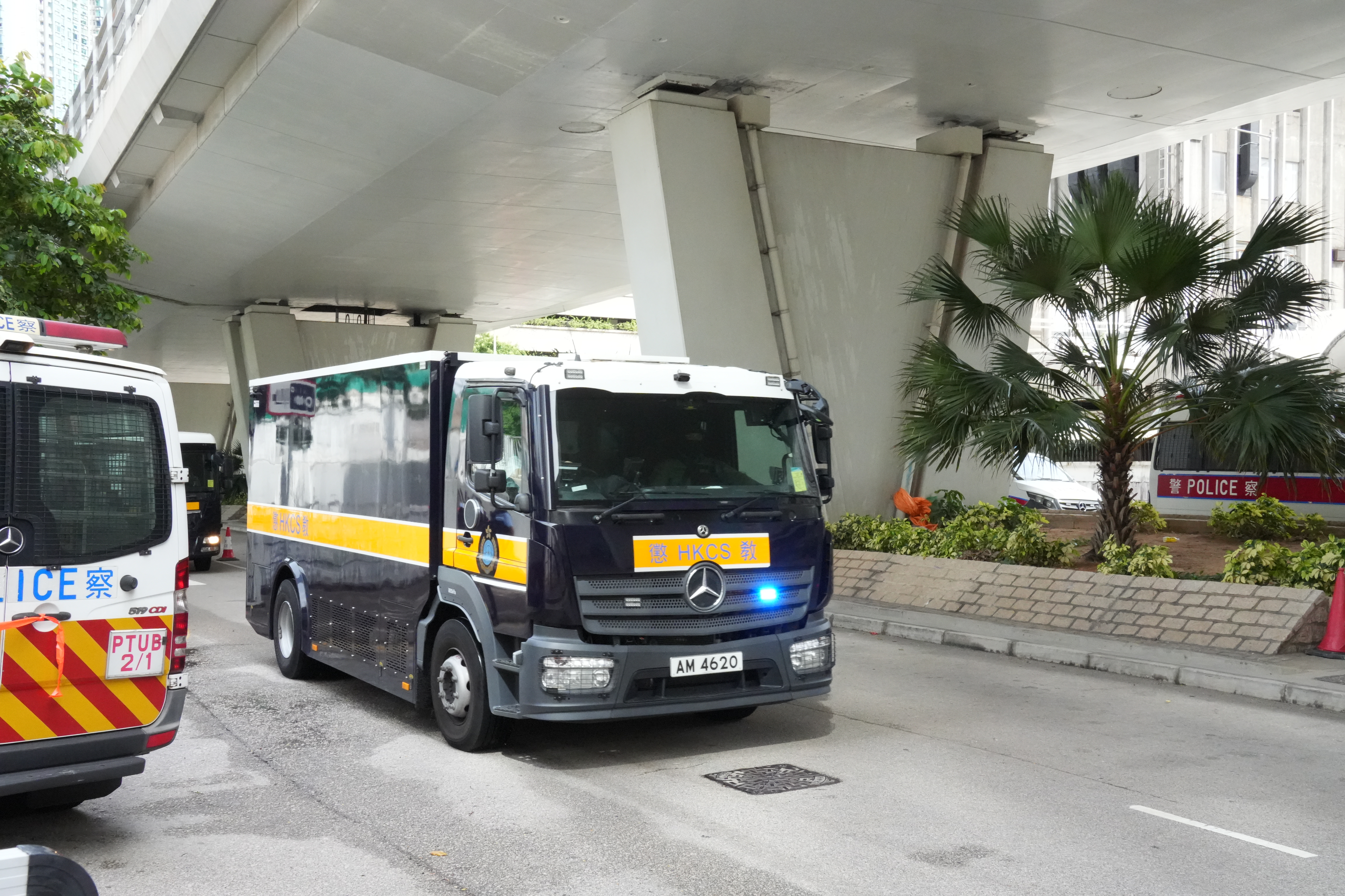 身穿卡其色西裝外套、白色裇衫的黎智英在配戴動態心電圖監測儀的情況下被3名懲教人員押解到庭。