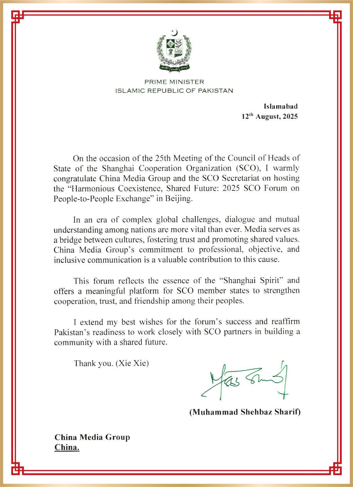 夏巴茲在賀信中指出,在當今複雜多變的國際格局中,不同文明、不同國家間的真誠對話與相互理解彌足珍貴。媒體作為文化溝通的橋樑,推動培育信任、弘揚共同價值觀。中國中央廣播電視總台秉持專業、客觀、包容的傳播理念,為此作出了寶貴貢獻。此次活動彰顯了「上海精神」,為上海合作組織成員國強化民間合作、信任與情誼提供了意義深遠的平台。巴基斯坦願與上海合作組織的夥伴們緊密協作,共築人類命運共同體,衷心預祝本次活動取得圓滿成功。