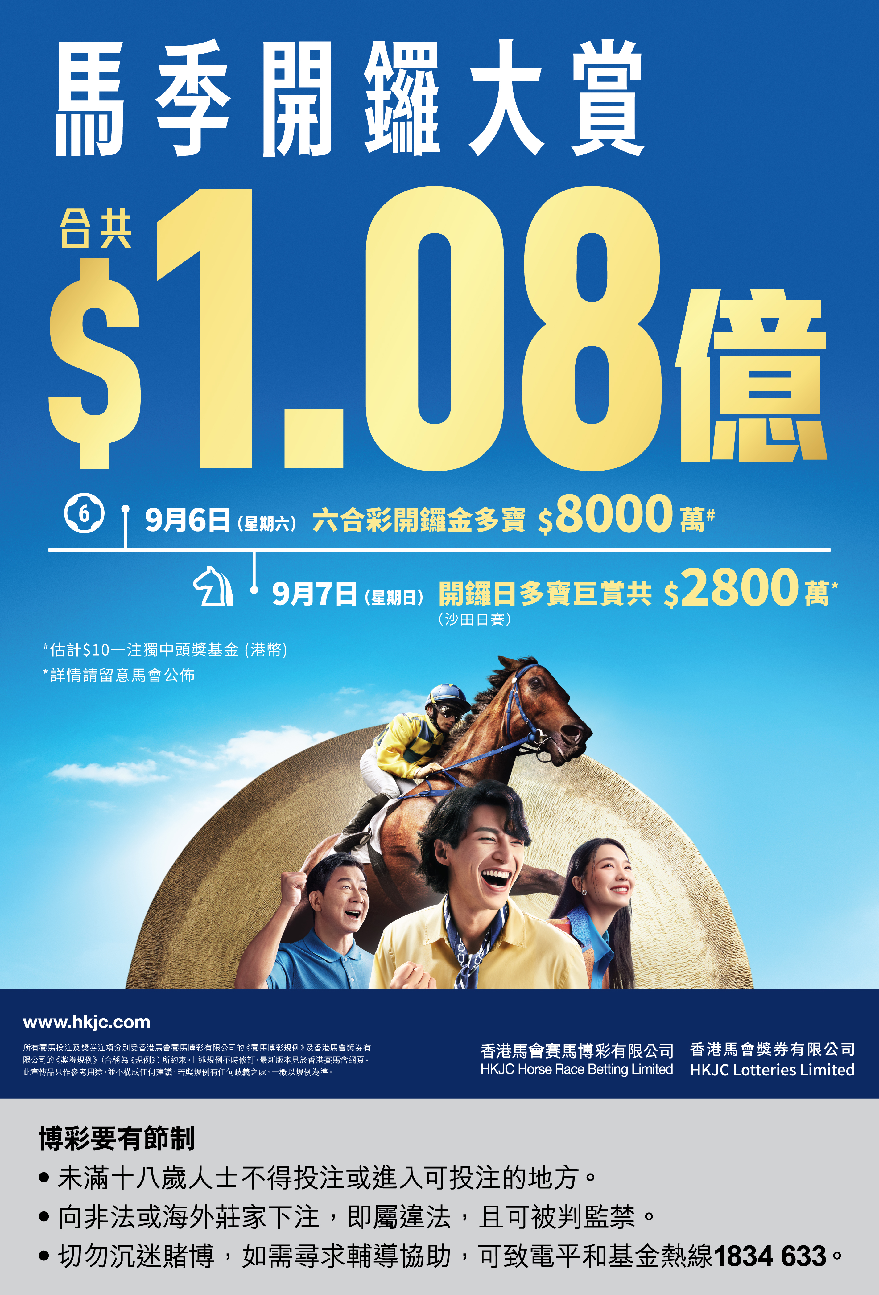 9月7日馬季開鑼日特設多寶巨賞,合共高達2800萬港元;而9月6日亦特設六合彩開鑼金多寶,若以港幣$10一注獨中,估計頭獎基金高達8000萬港元;周末總獎金合共超過1億港元!詳情請留意馬會公布。