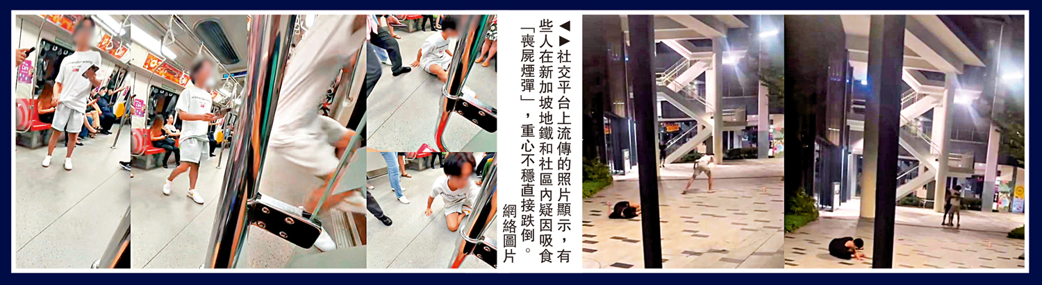 從去年開始,「喪屍煙彈」在新加坡青少年間盛行,它外觀與普通電子煙無異,包裝時尚、伴有水果香氣,令一些青少年誤以為是無害的潮流物品。吸食者可能會出現全身肌肉痙攣等,也可能會引發嚴重副作用,包括噁心嘔吐或意識混亂,造成器官衰竭或死亡。
