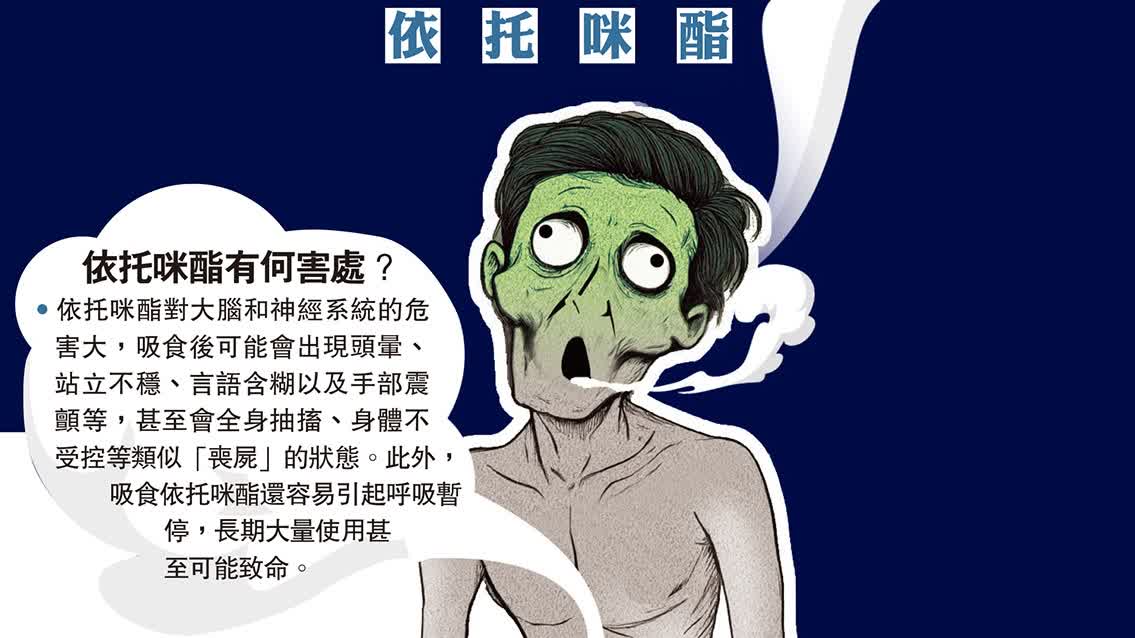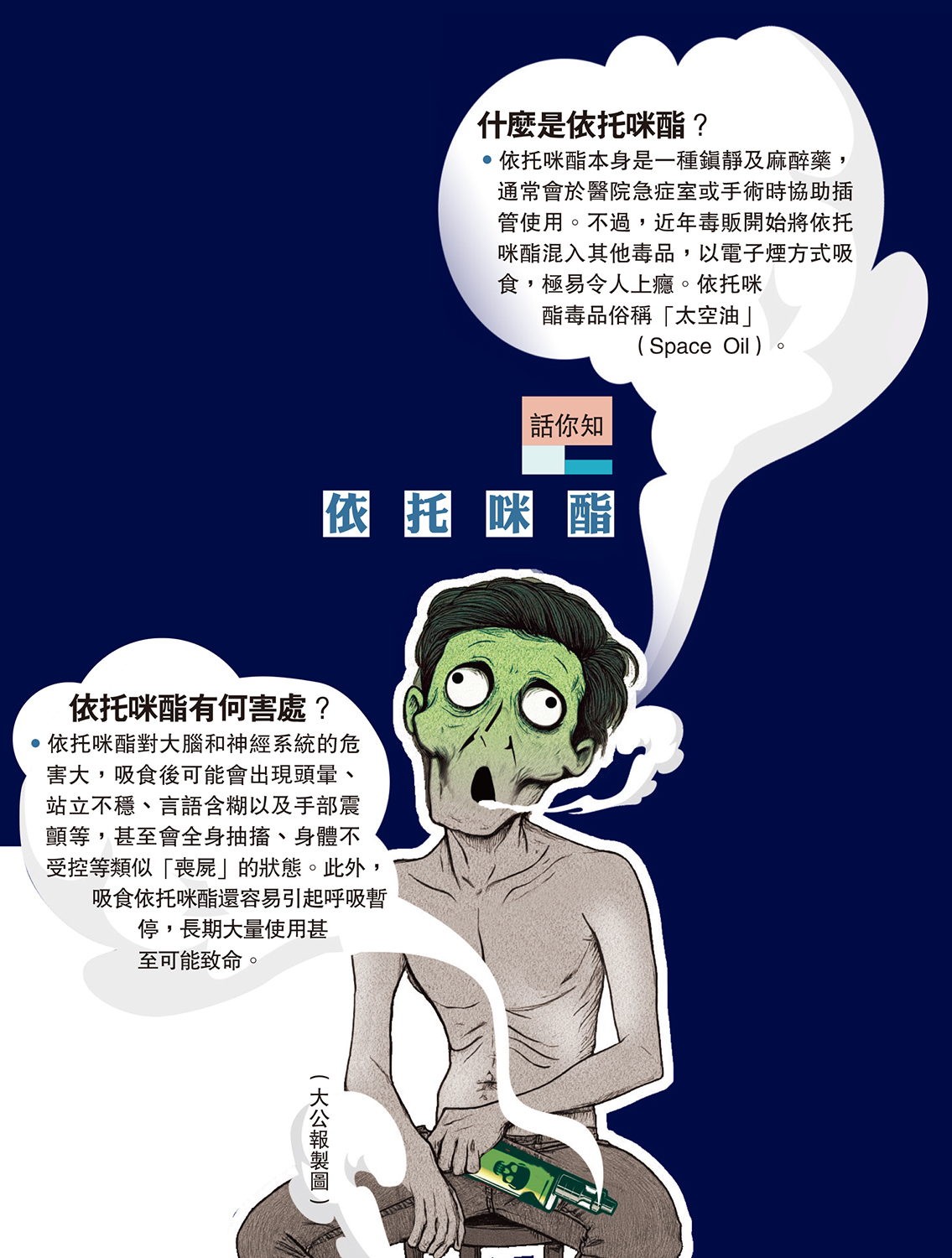 大公報綜合報道,新加坡政府24日表示,自9月1日起正式將依托咪酯(etomidate)列為該國《濫用毒品法令》C級毒品,吸食者須接受強制勒戒等,屢犯者可能會判囚一年,販賣者則面臨最高20年監禁及鞭刑。這種俗稱「喪屍煙彈」(或「太空油」)的新型毒品,將麻醉藥「依托咪酯」和其他具成癮及危害性物質混入電子煙,吸食者會出現神志不清,舉止恍惚,宛如喪屍,甚至有少女吸食後出現幻覺墮樓身亡。