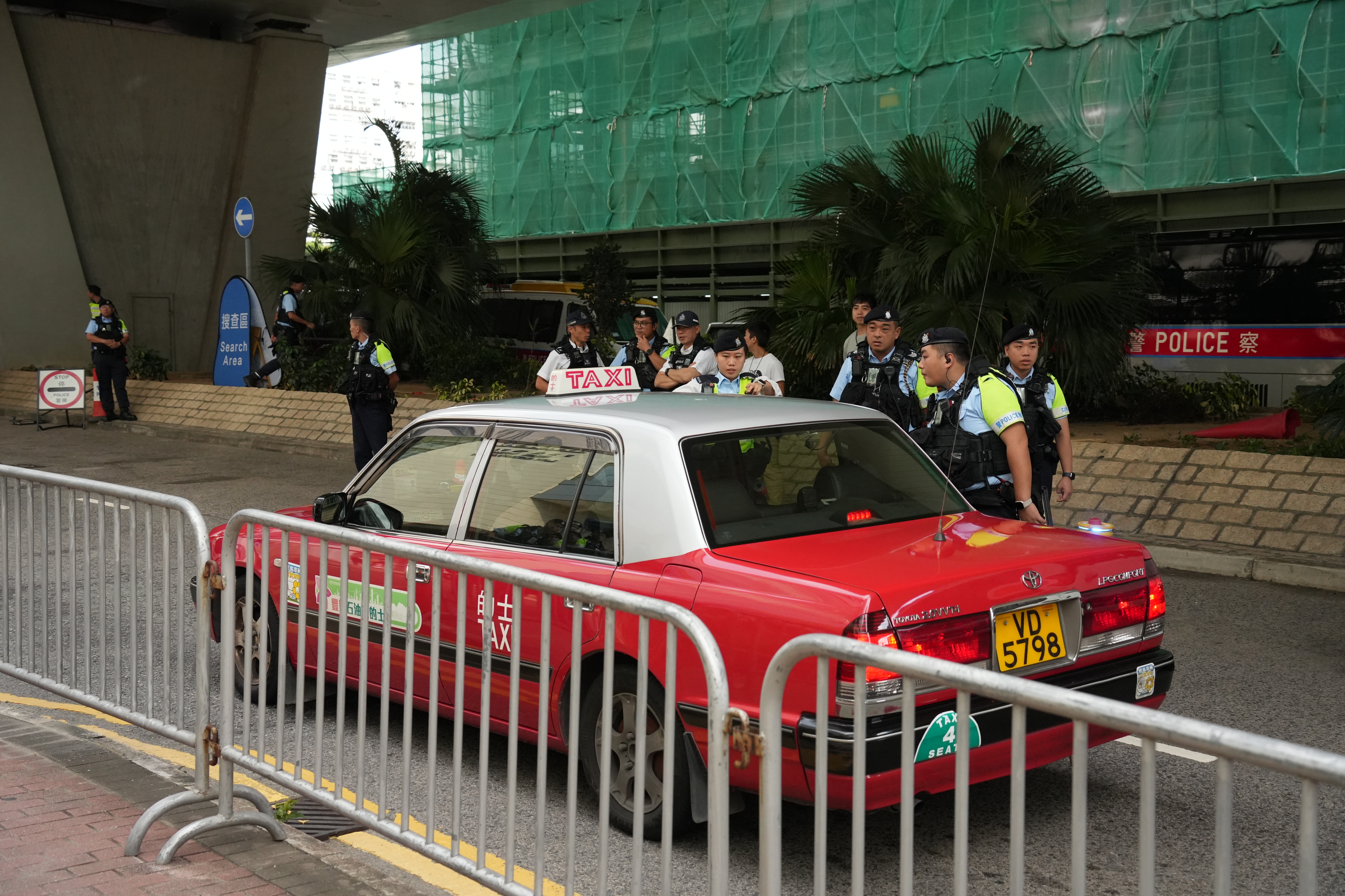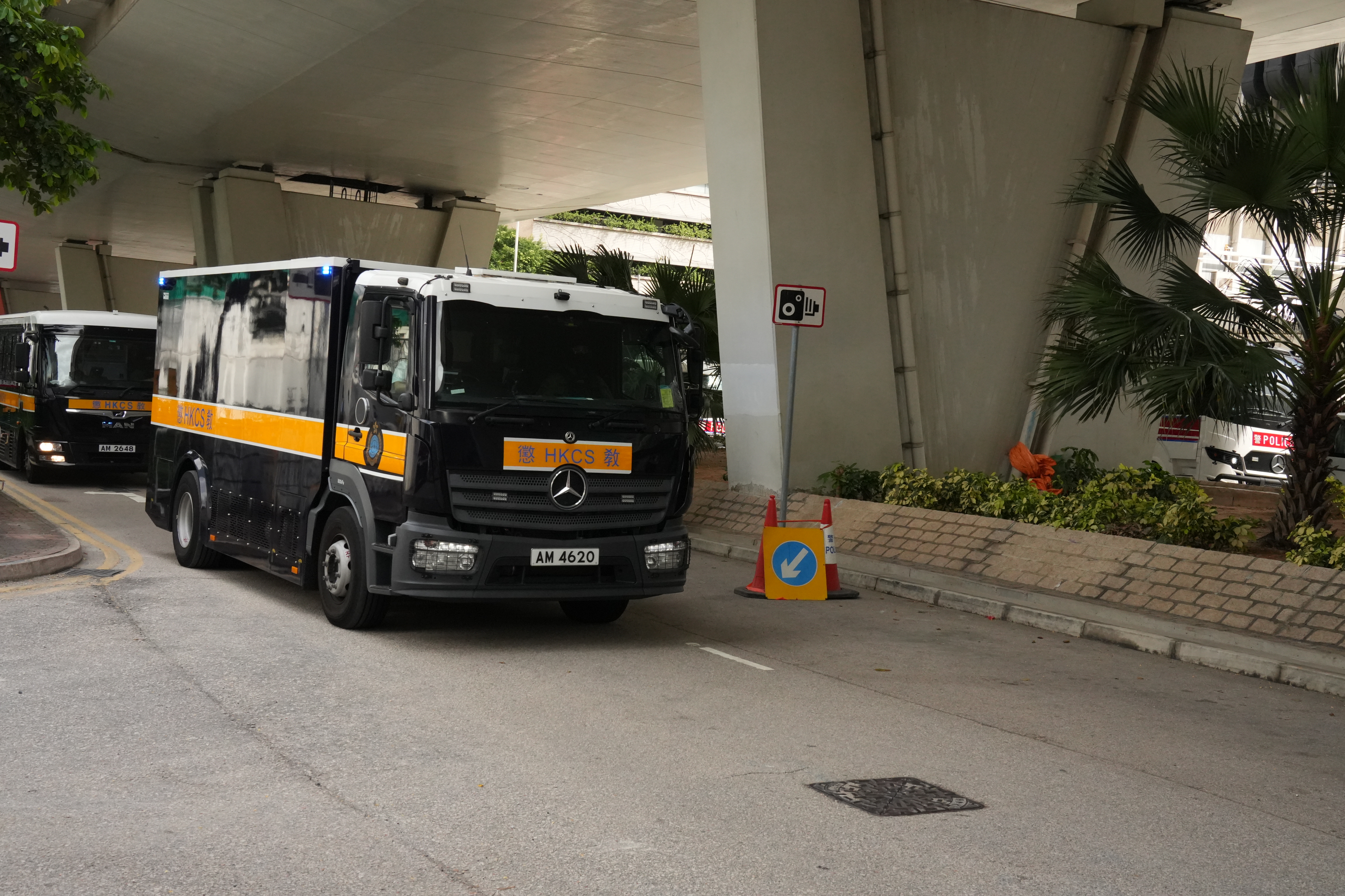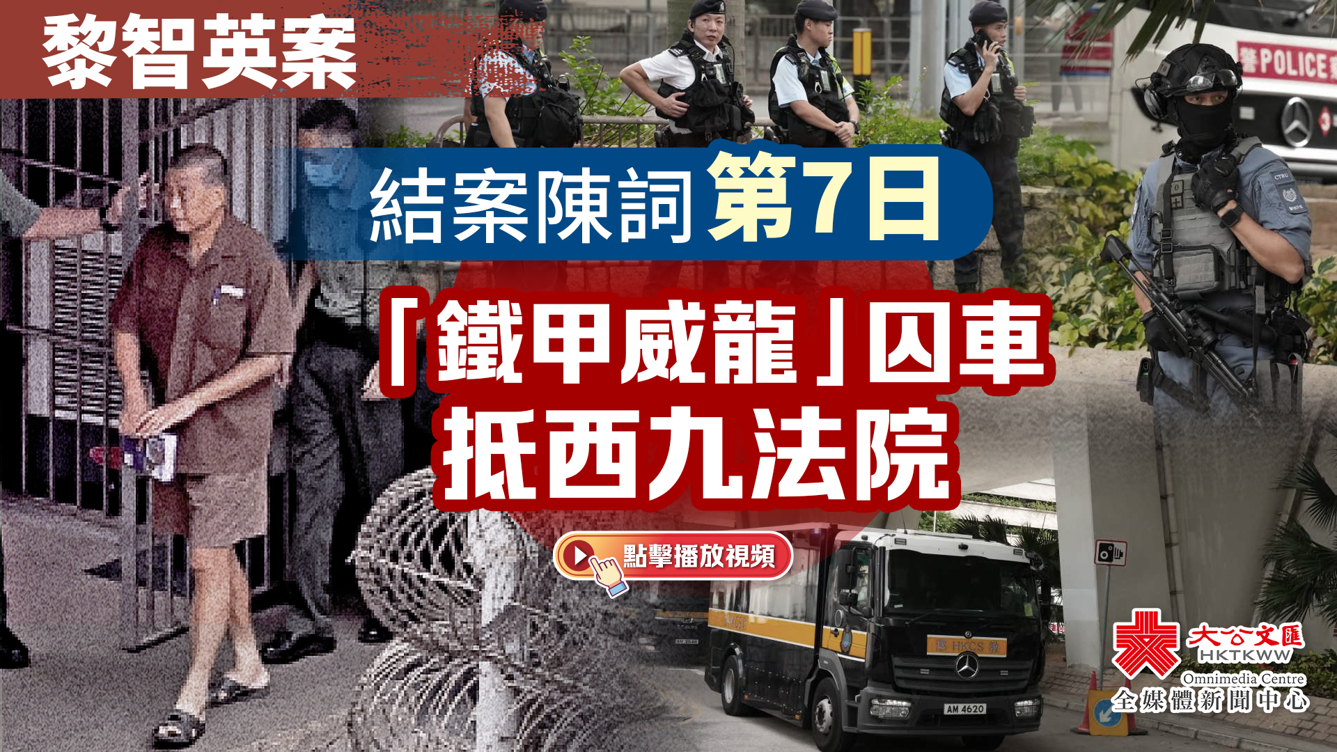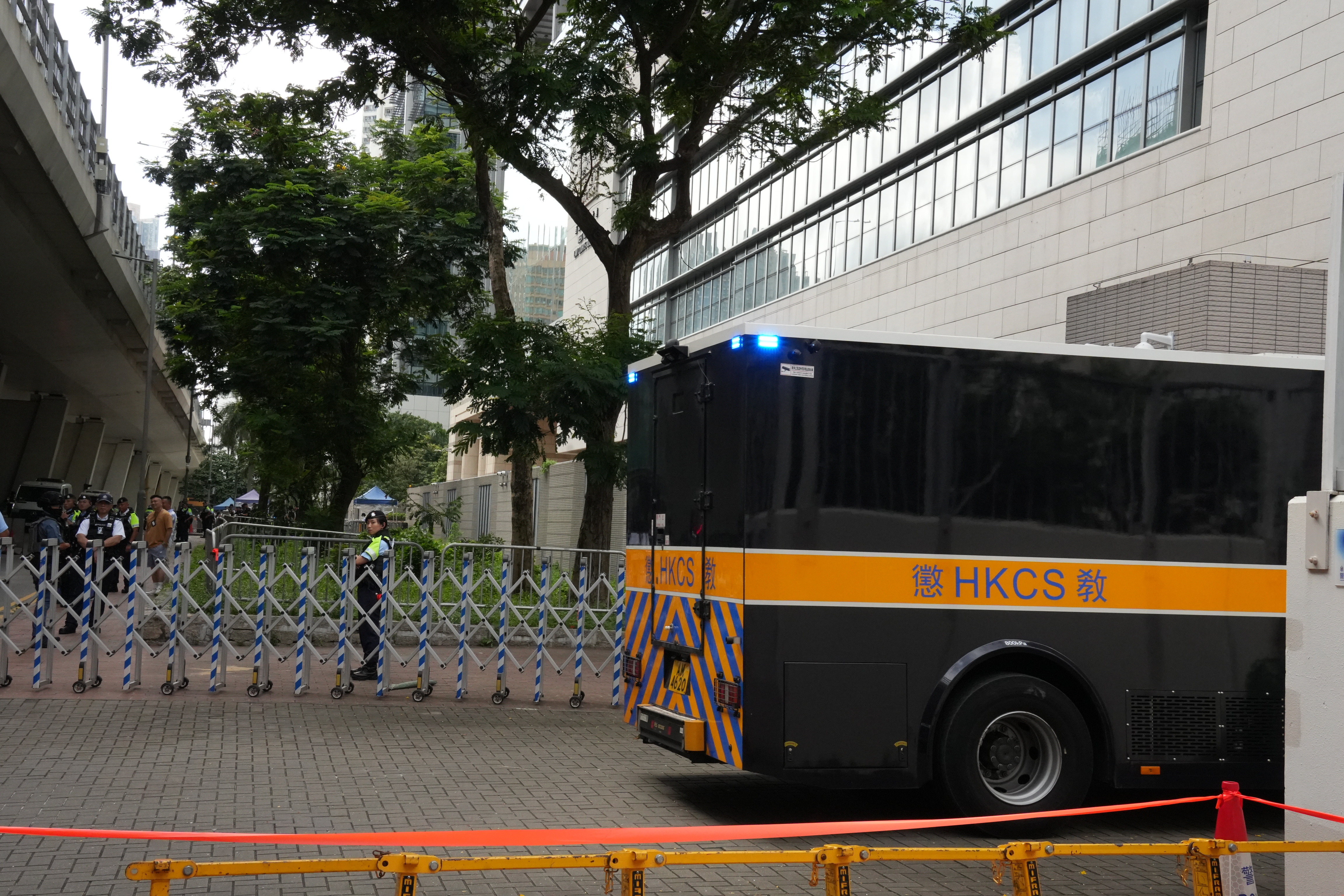 上午9時18分左右,載有黎智英的「鐵甲威龍」囚車抵達西九龍裁判法院,並且有反恐特勤隊隊員持槍戒備。除此之外,法院外保安措施顯著加強,至少十多輛警車駐守戒備,數十名穿着防刺戰術背心的警員在場巡邏,有警犬協助執勤搜索。同時,警方在法院外圍設置警崗,對可疑車輛進行搜查,確保沒有危險物品。