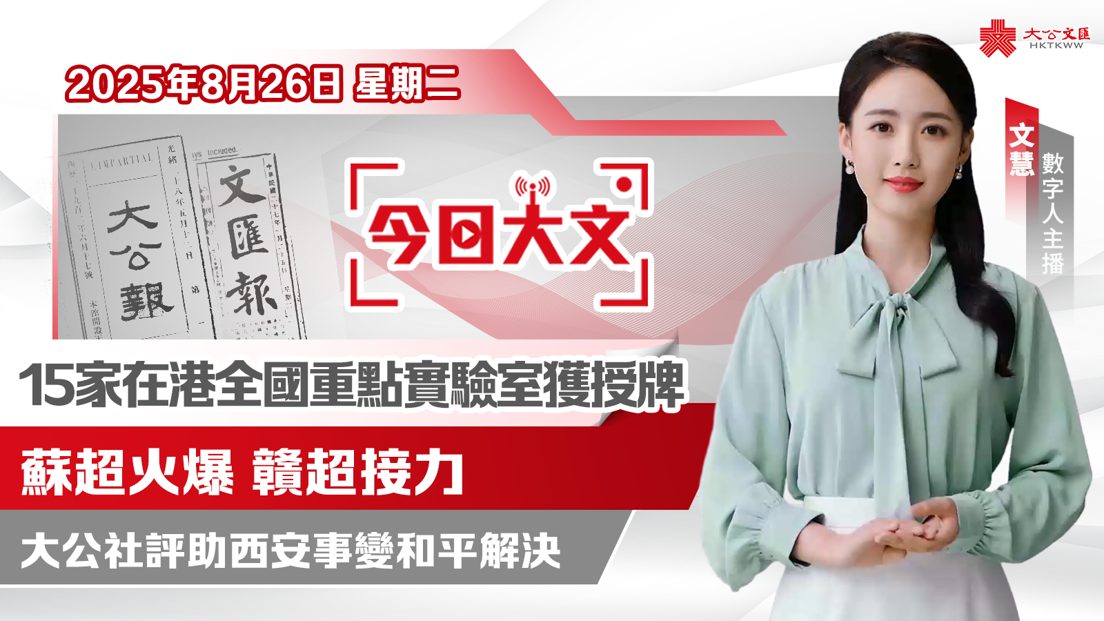今天是2025年8月26日(星期二),大公文匯網與您速覽報紙看點。
