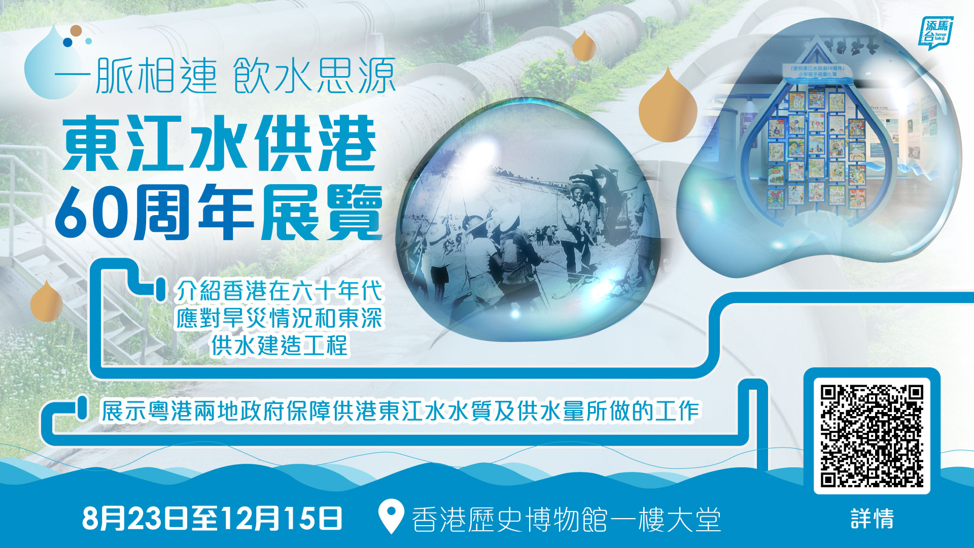 「一脈相連 飲水思源 — 東江水供港60周年」展覽8月23日起在香港歷史博物館舉辦,透過珍貴歷史相片及文字內容,介紹香港在六十年代應對旱災情況和當時東深供水建造工程,以及粵港兩地政府就保障供港東江水水質及供水量所做的工作。展覽免費入場,歡迎大家參觀。