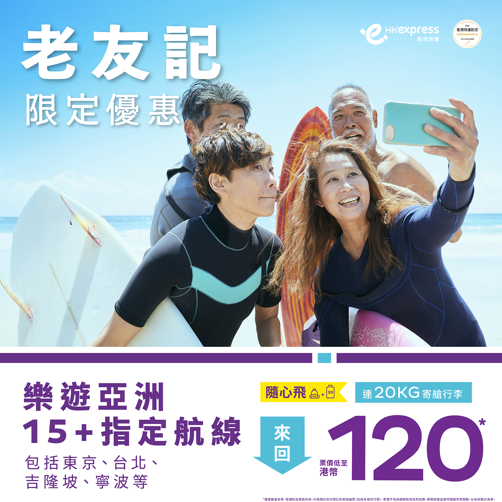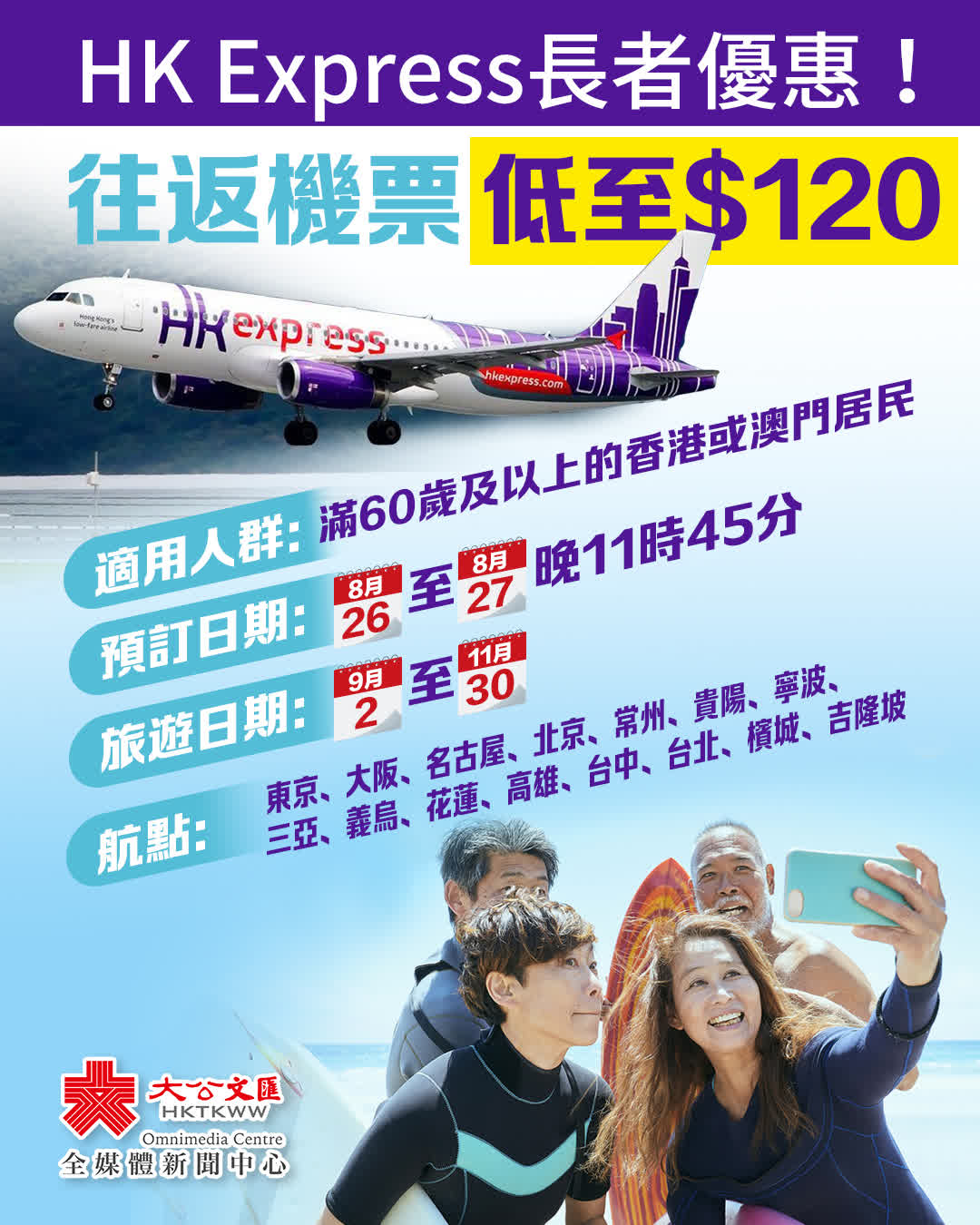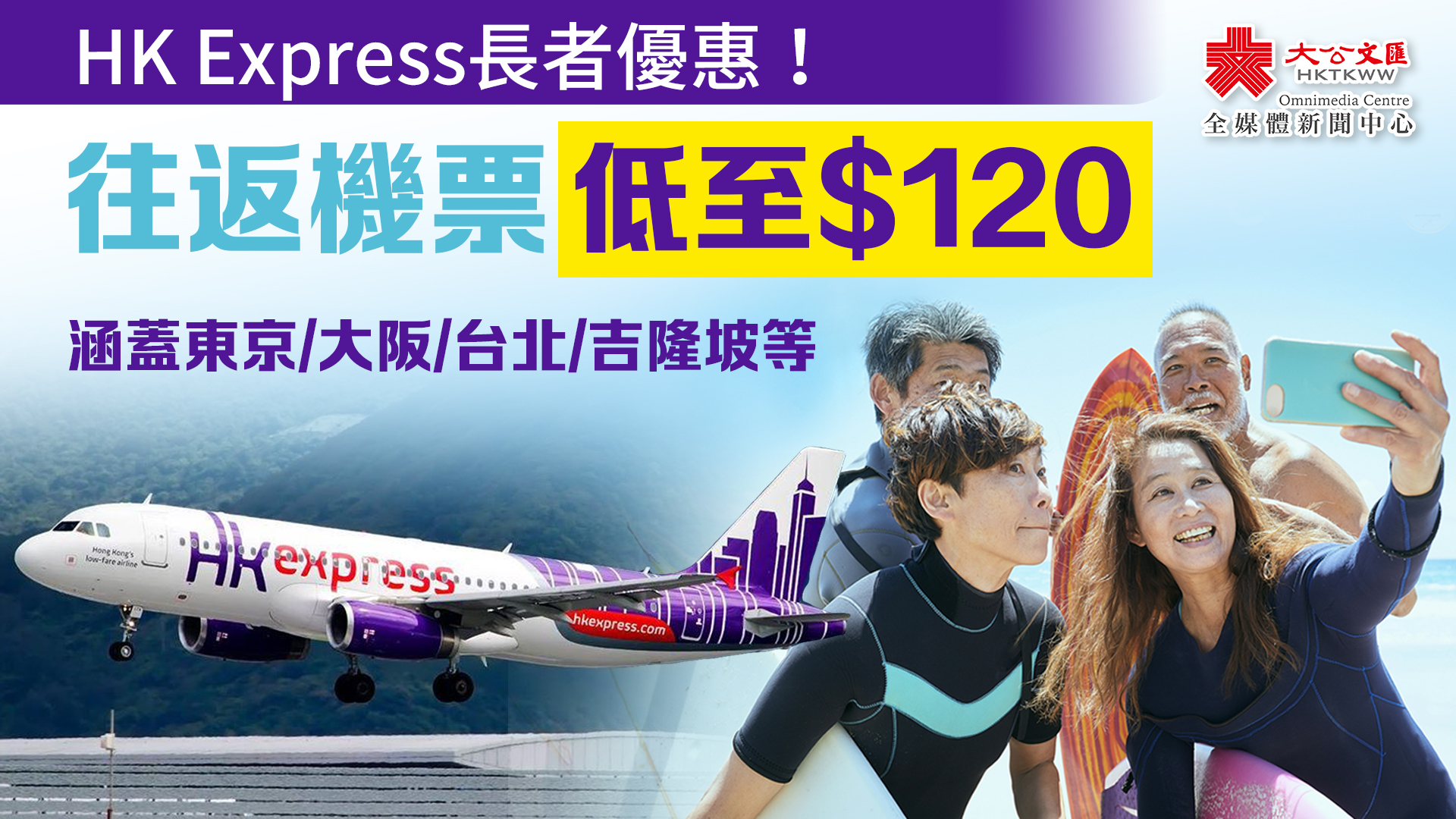 大公文匯全媒體報道,HK Express推長者優惠喇!今明一連兩日(8月26日至27日)年滿60歲的香港或澳門居民,均可透過HK Express官網預訂平價機票,當中低至$120的「隨心飛」來回機票,包含一件隨身物品及一件20KG寄艙行李;另有$320起的「無憂飛」,來回機票包含一件隨身物品、一件登機行李、一件32KG寄艙行李及標準座位選擇。