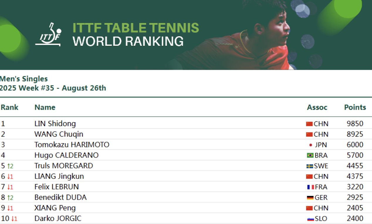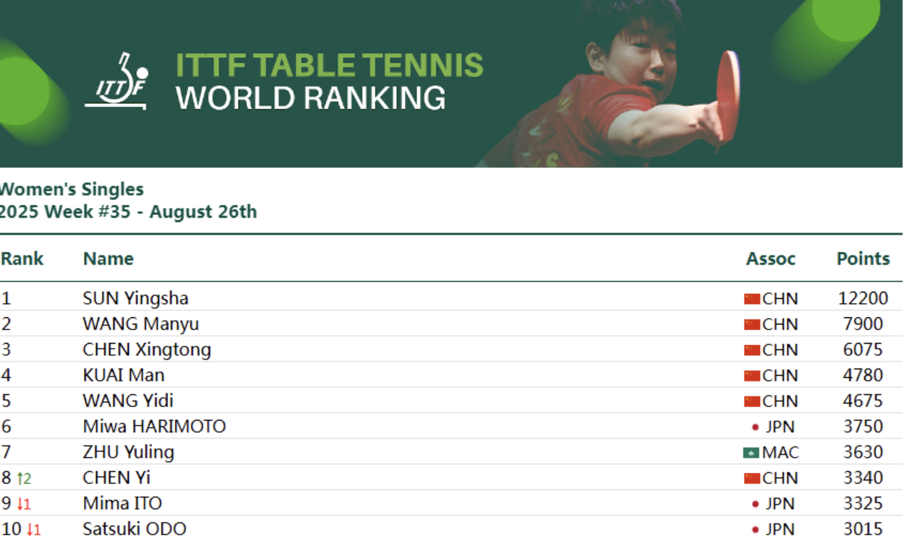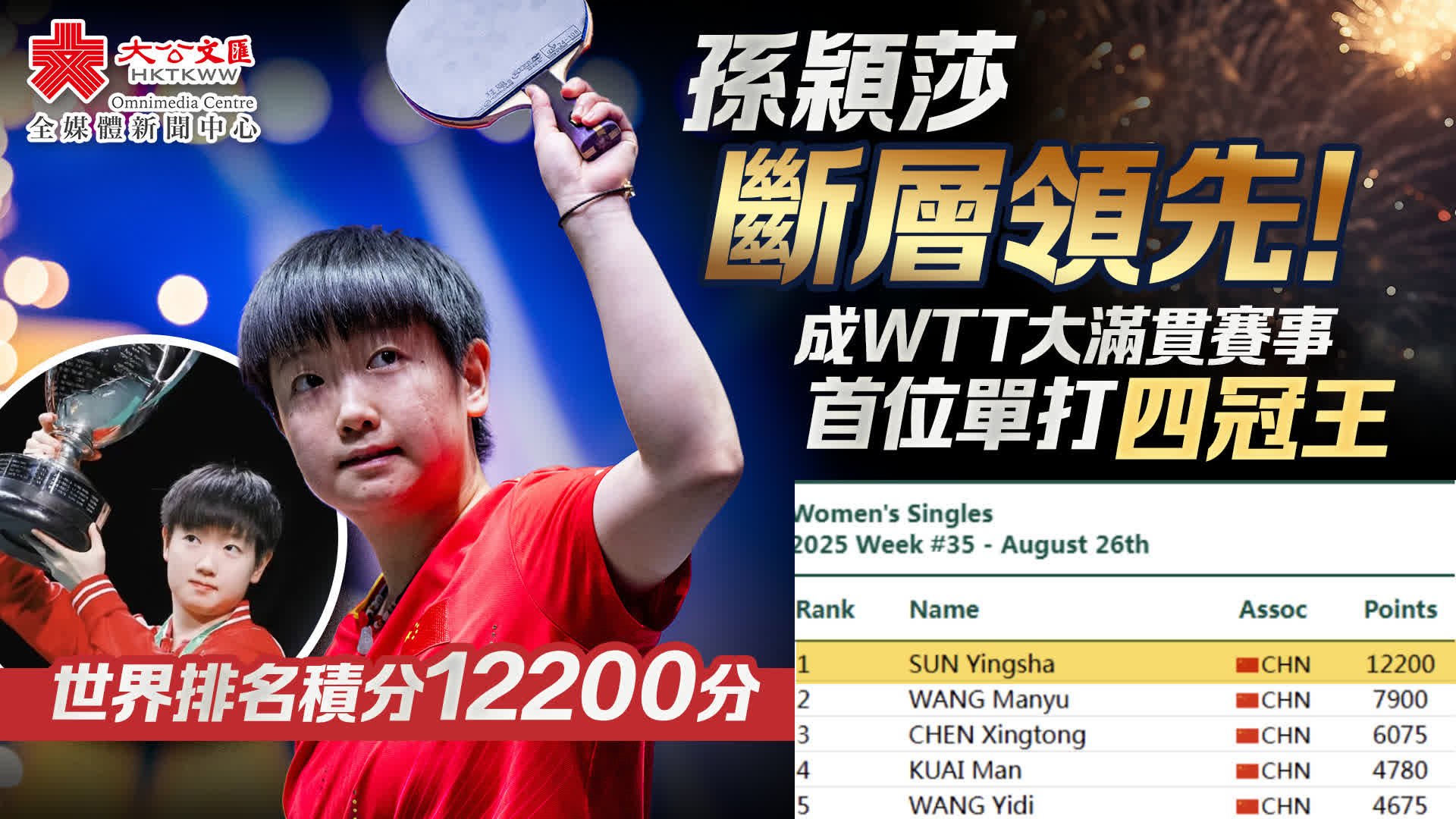 大公文匯全媒體報道,8月26日,國際乒聯更新了2025年第35周的世界排名。其中,孫穎莎在WTT歐洲大滿貫瑞典站女單奪冠後,成為WTT大滿貫賽事首位單打四冠王,也成為乒乓球史上首位世界排名積分突破12000分的運動員。