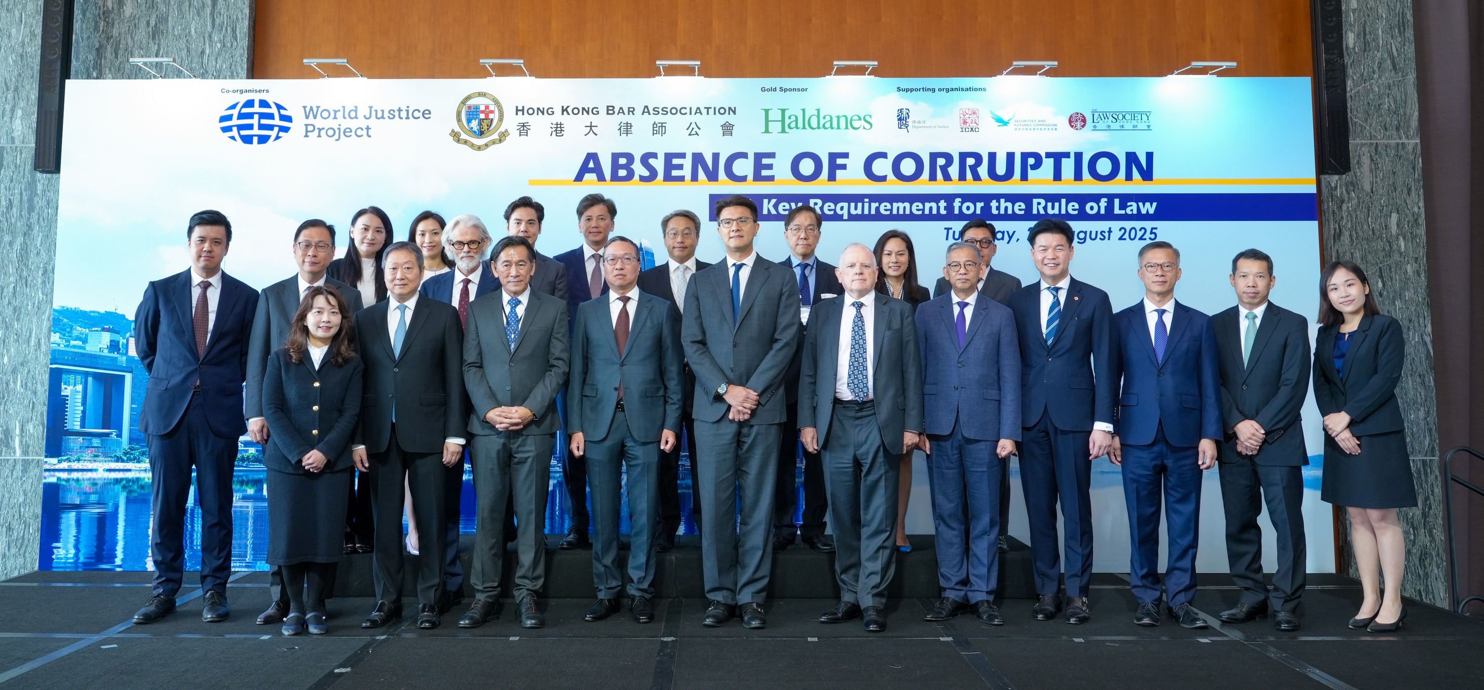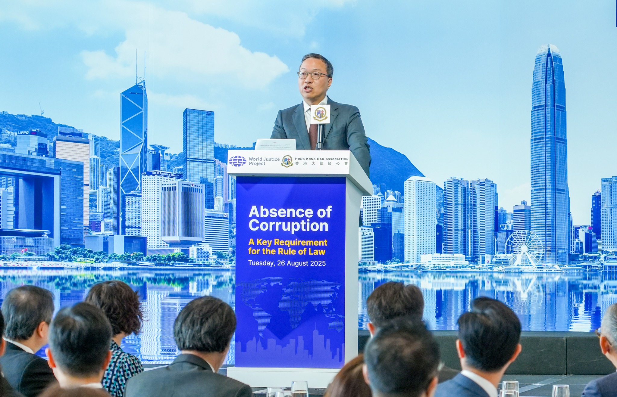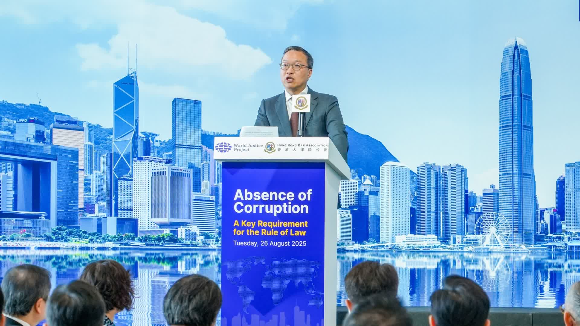 大公文匯全媒體報道,由香港大律師公會及世界正義工程(World Justice Project,WJP)舉辦的「杜絕貪污—法治關鍵」論壇今日(26日)開幕。律政司司長林定國,廉政專員胡英明,證監會主席黃天祐,香港大律師公會主席毛樂禮,香港律師會會長湯文龍等嘉賓蒞臨現場。
