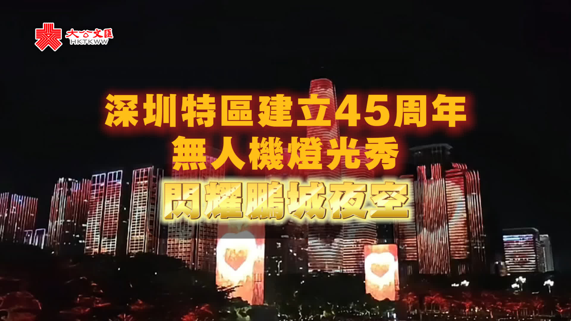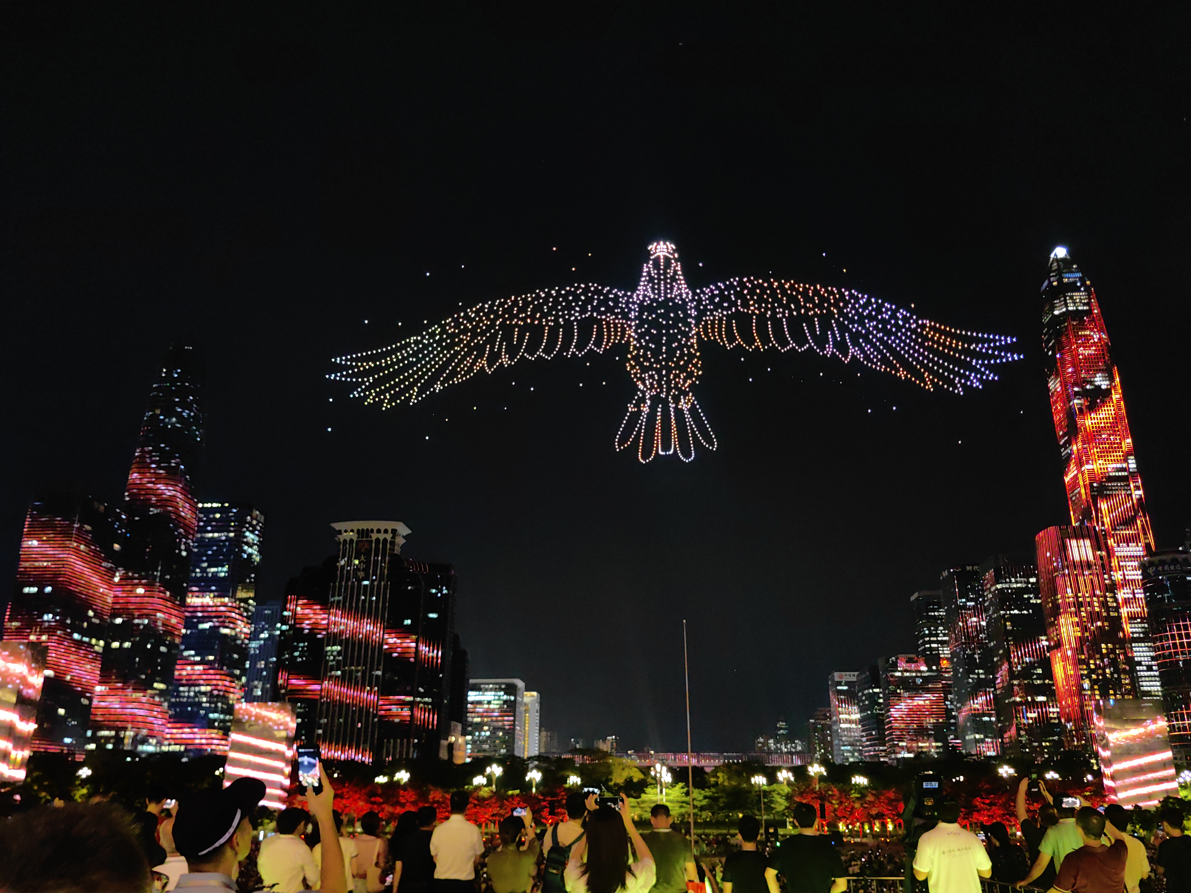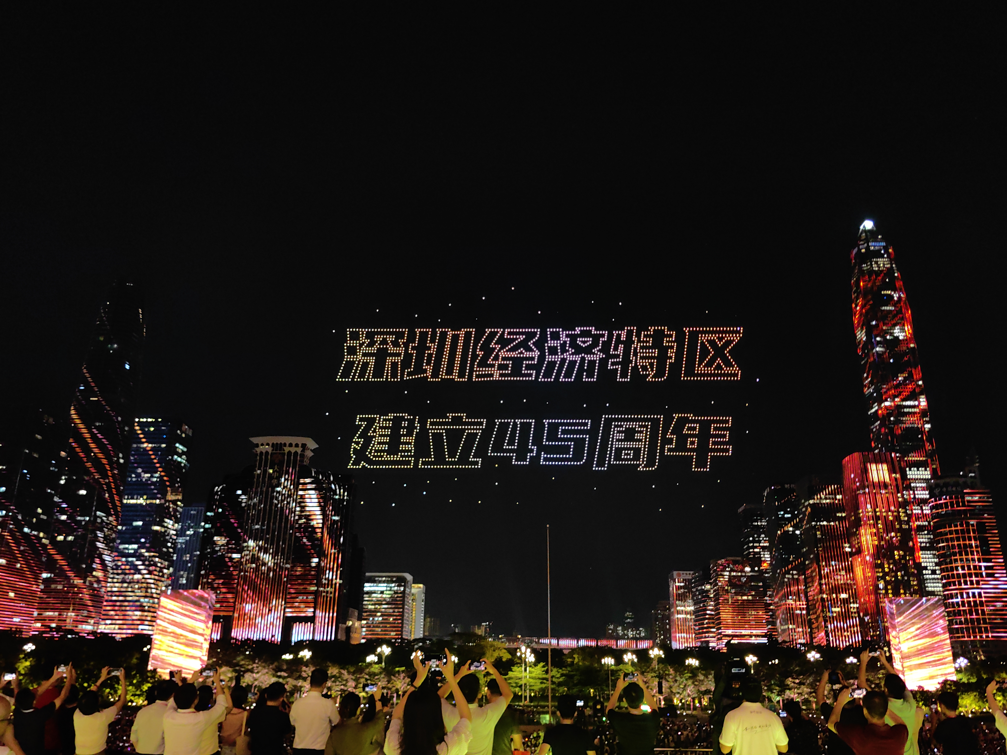 (大公文匯網 記者 郭若溪、胡永愛)8月26日晚上8時26分,深圳經濟特區建立45周年無人機燈光秀表演在深圳市民廣場、深圳人才公園雙主場同時舉行。1.2萬架無人機騰空而起,與城市燈光秀交相輝映,以天空為幕、以科技為筆,為市民遊客獻上了一場科技與藝術共舞的視覺盛宴,向世界生動講述了深圳經濟特區建立45年的發展奇跡。