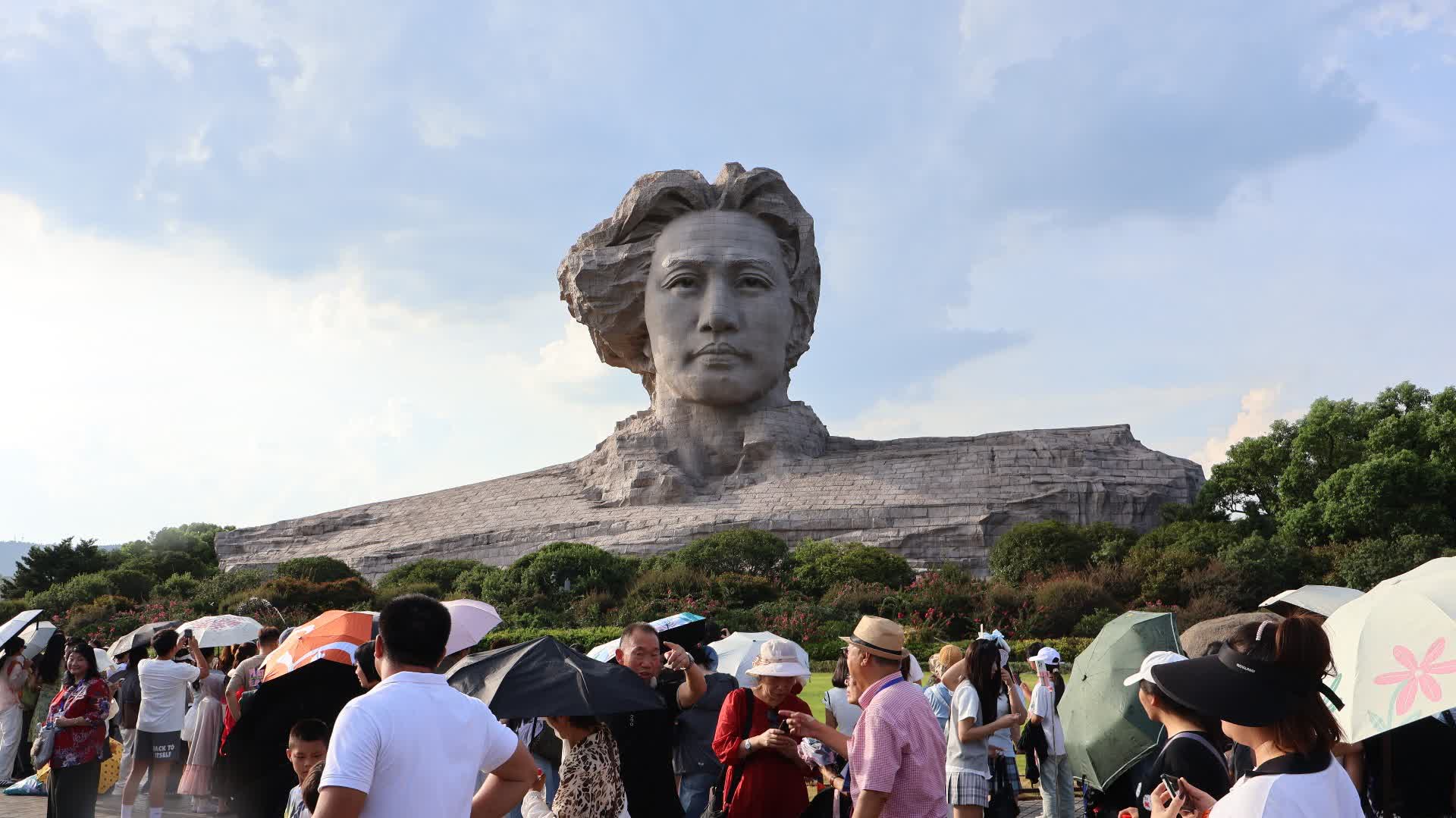 暑期的橘子洲人頭攢動,觀光車擠滿了遊客,湘江邊遊客駐足打卡,在青年毛澤東藝術雕像周圍,更是圍得水泄不通,遊客們高舉手機,多角度與青年毛澤東藝術雕像合影。據介紹,青年毛澤東藝術雕像高32米,寓意毛澤東32歲時在這裏寫下《沁園春·長沙》,「恰同學少年,風華正茂,書生意氣,揮斥方遒……」讓橘子洲名揚天下。