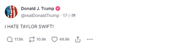 2024年美國總統競選期間,Taylor Swift曾高調支持特朗普的競爭對手民主黨總統候選人哈里斯,並公開呼籲歌迷投票給哈里斯。特朗普其後在社交平台發文,寫道:「我憎恨Taylor Swift!」