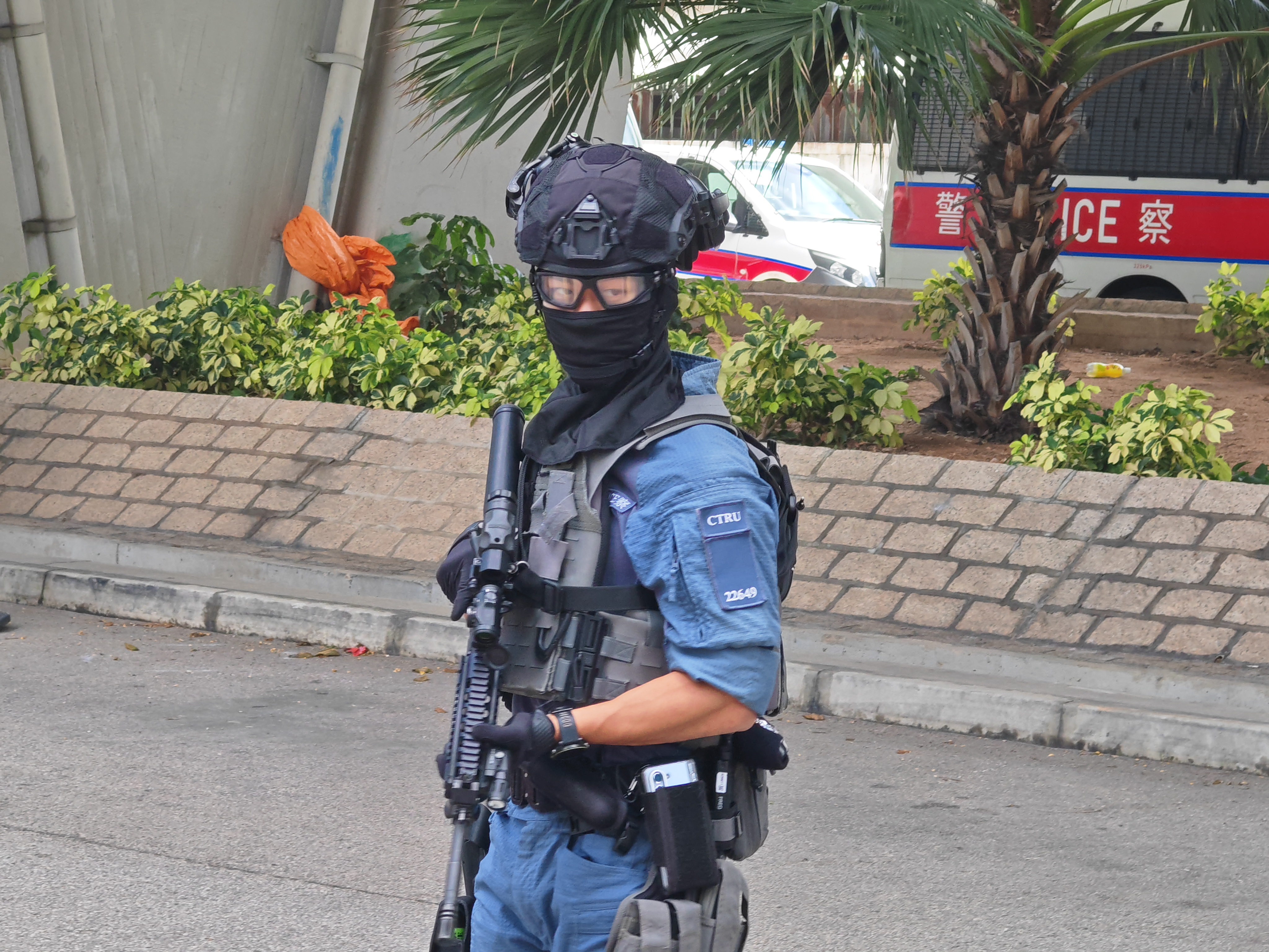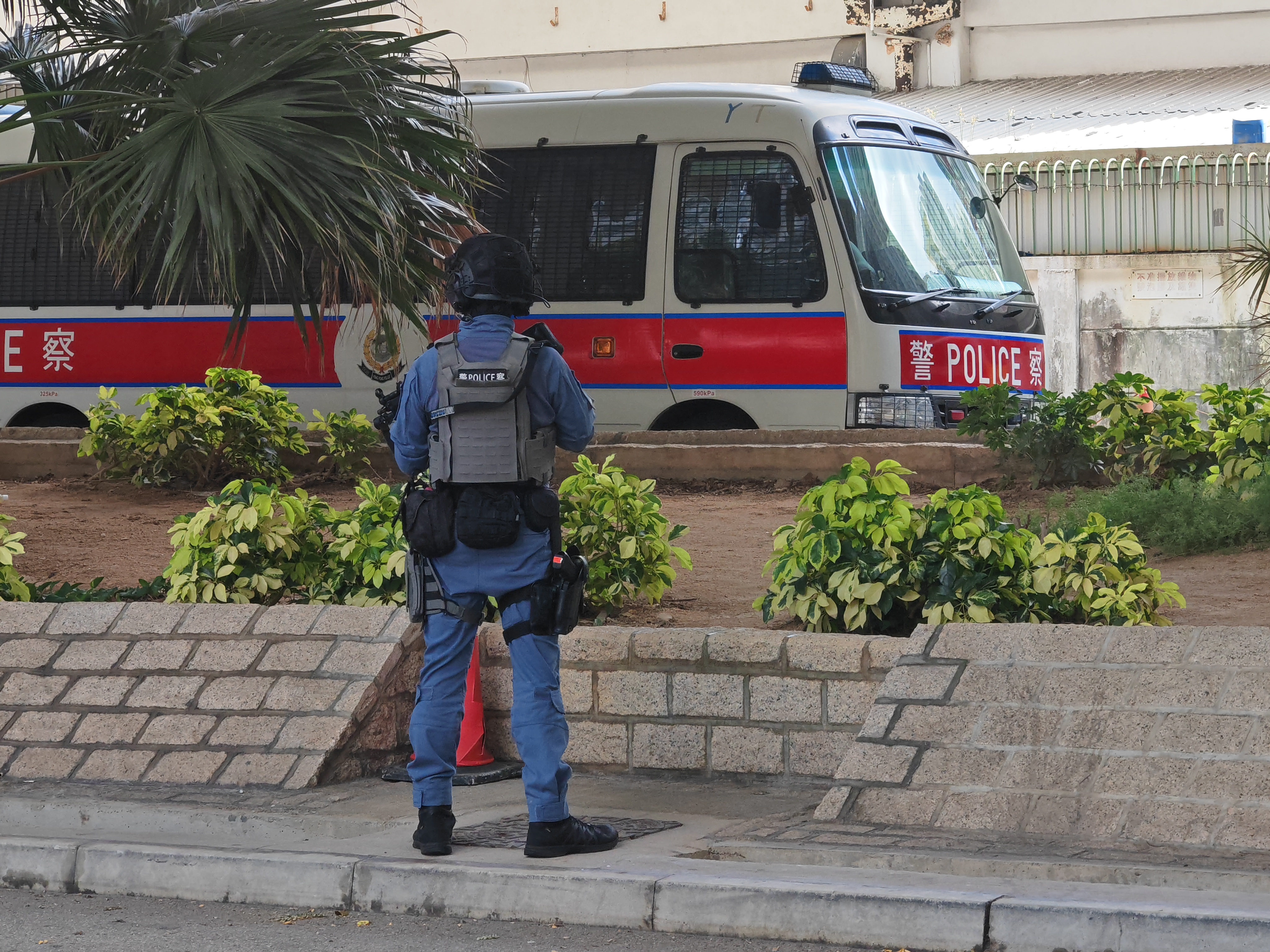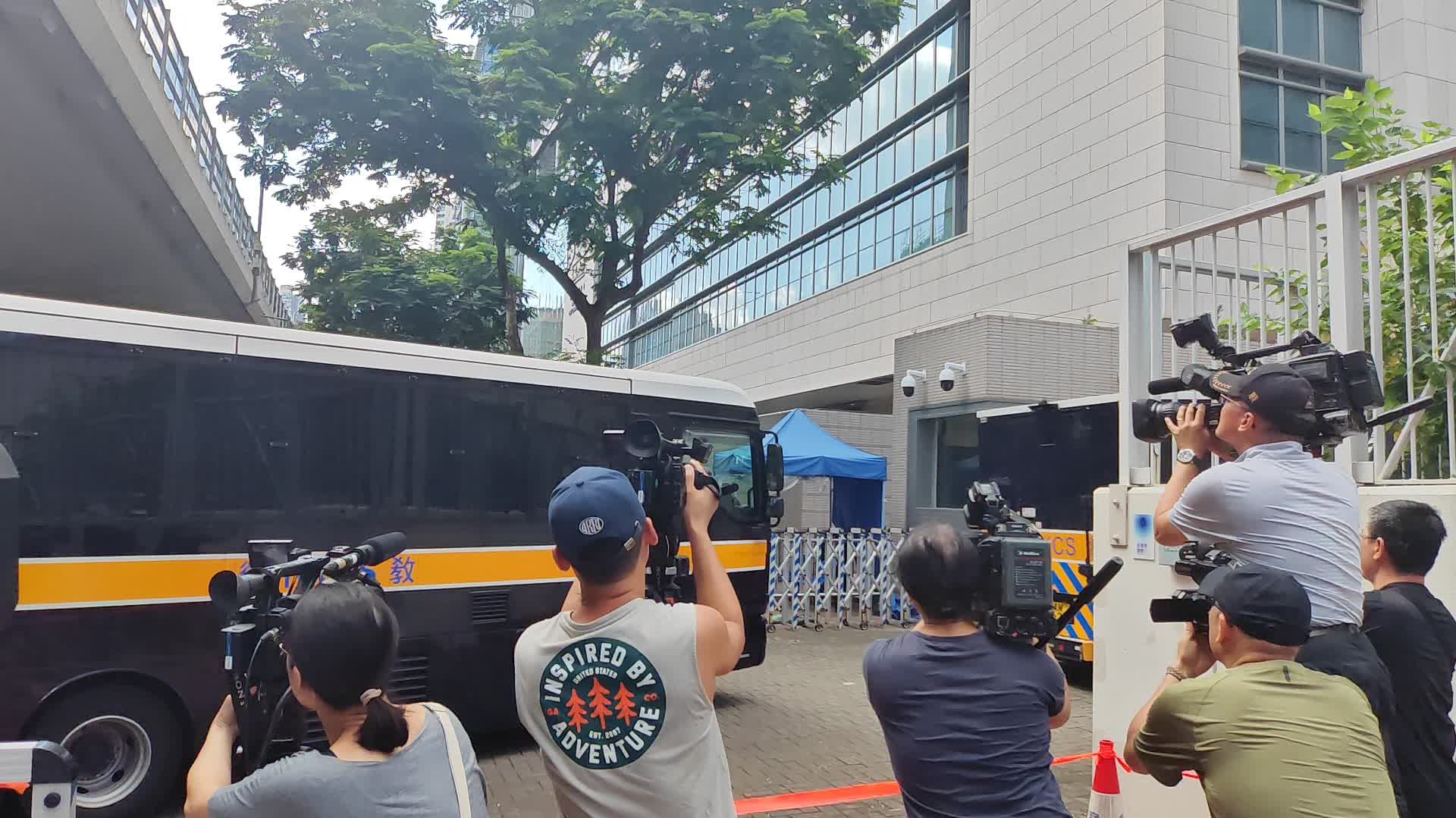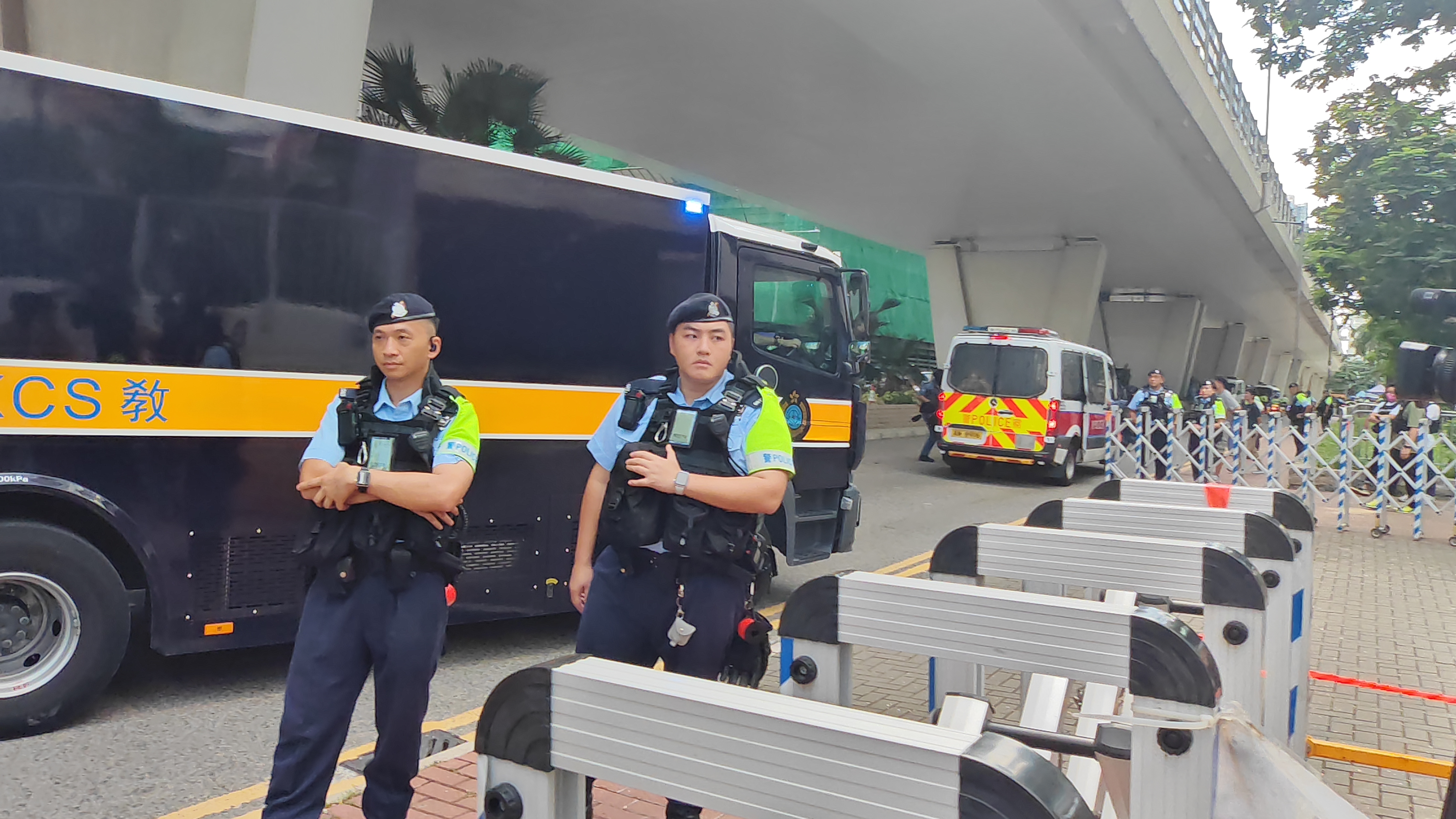 上午9時18分左右,載有黎智英的「鐵甲威龍」囚車抵達西九龍裁判法院,並且有反恐特勤隊隊員持槍戒備。除此之外,法院外保安措施顯著加強,至少十多輛警車駐守戒備,數十名穿着防刺戰術背心的警員在場巡邏,有警犬協助執勤搜索。同時,警方在法院外圍設置警崗,對可疑車輛進行搜查,確保沒有危險物品。