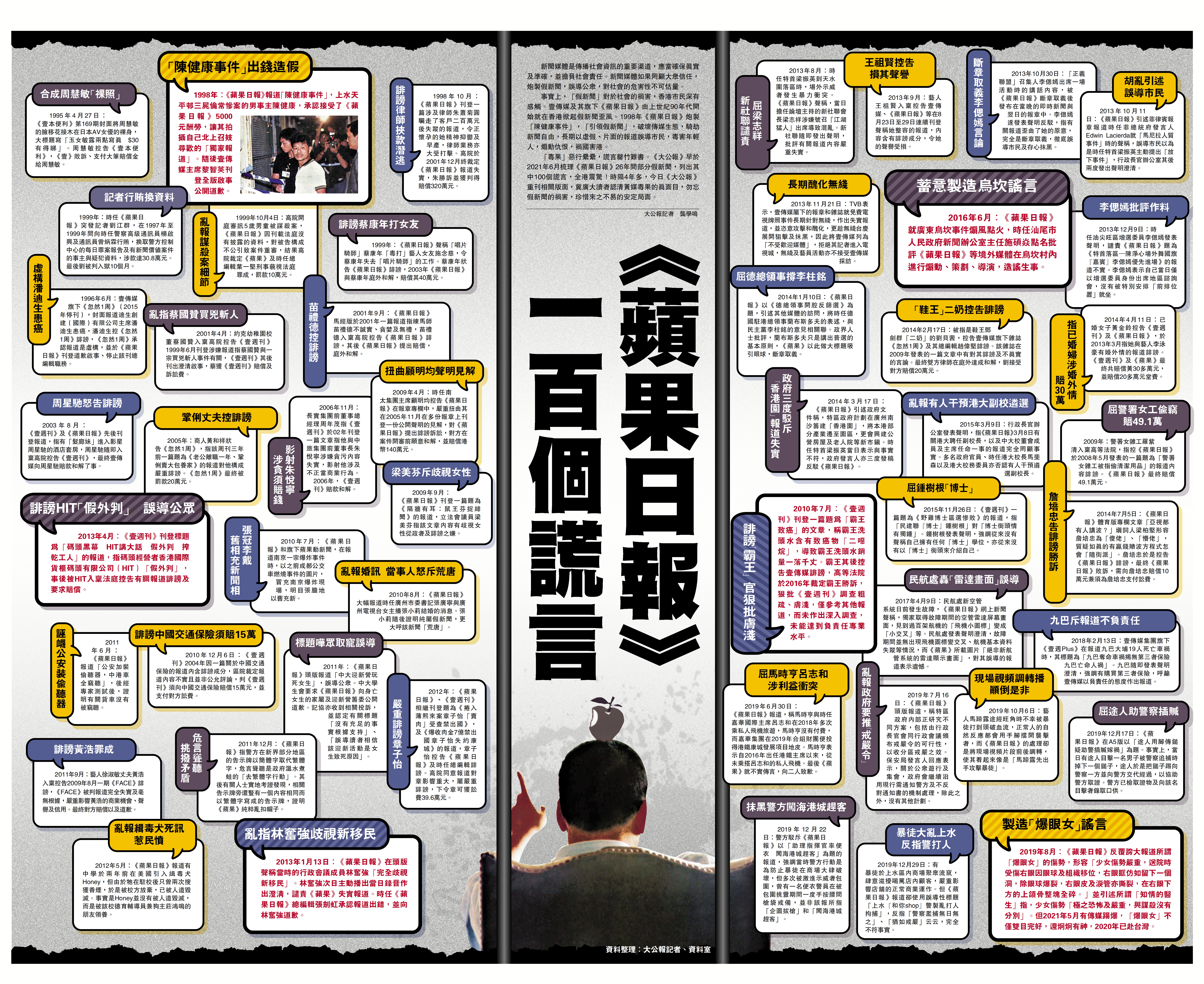 「毒果」惡行纍纍,謊言罄竹難書。《大公報》早於2021年6月梳理《蘋果日報》26年間部分假新聞,列出其中100個謊言,全港震驚!時隔4年多,今日《大公報》重刊相關版面,冀廣大讀者認清黃媒毒果的真面目,勿忘假新聞的禍害,珍惜來之不易的安定局面。