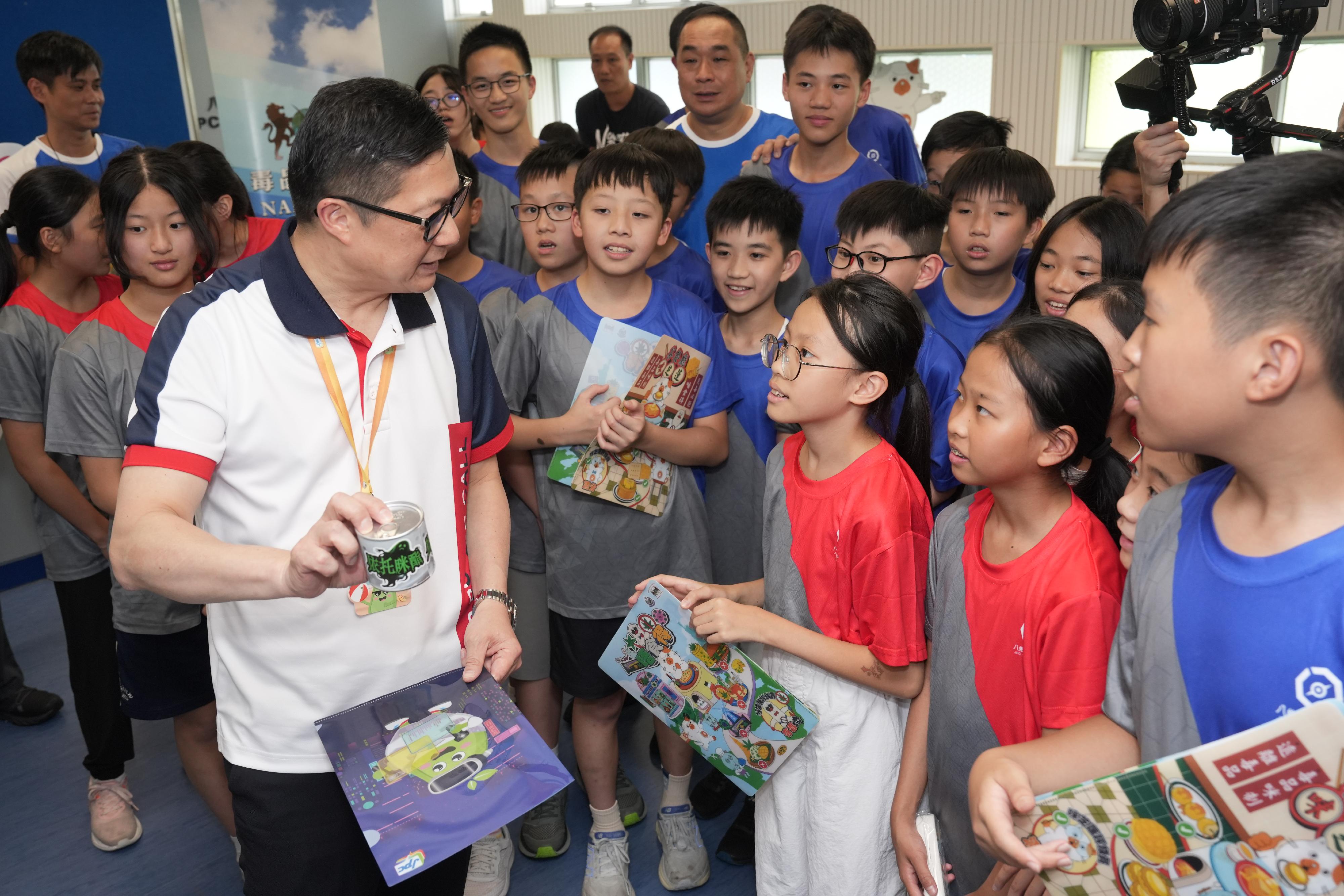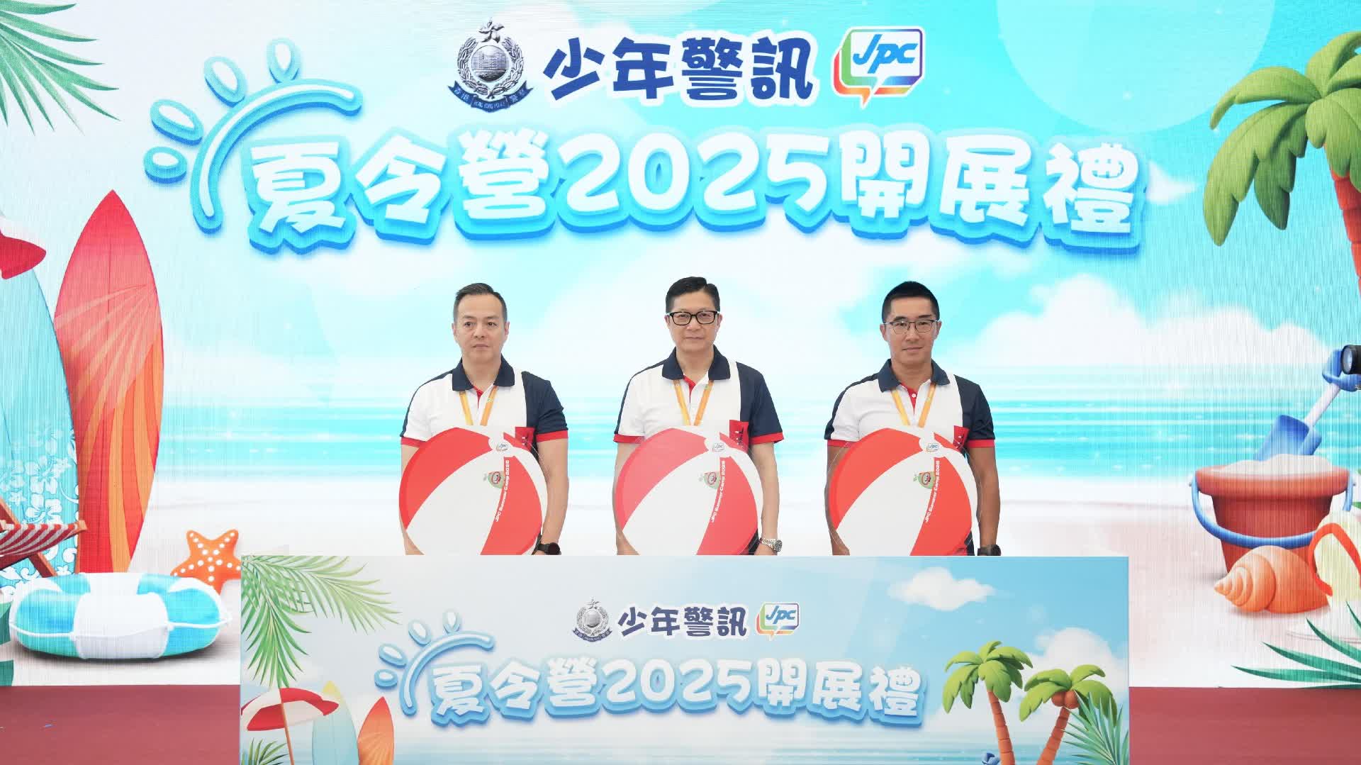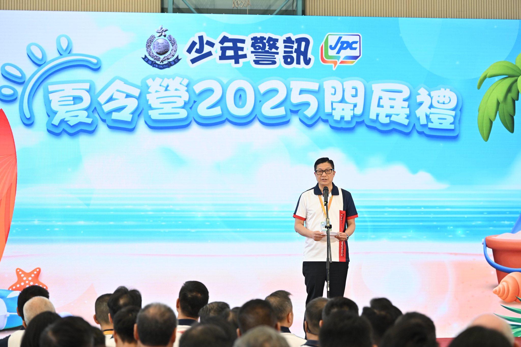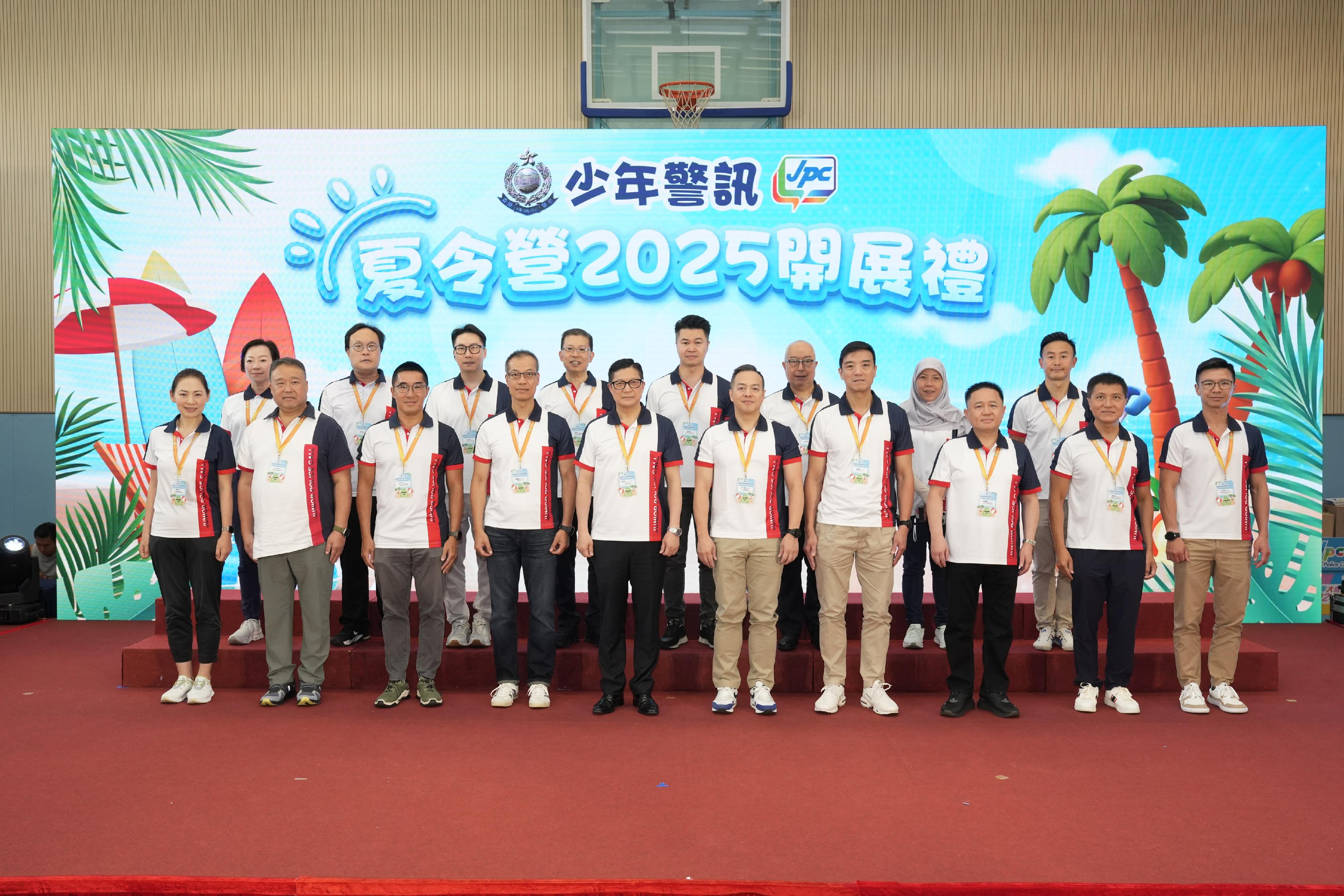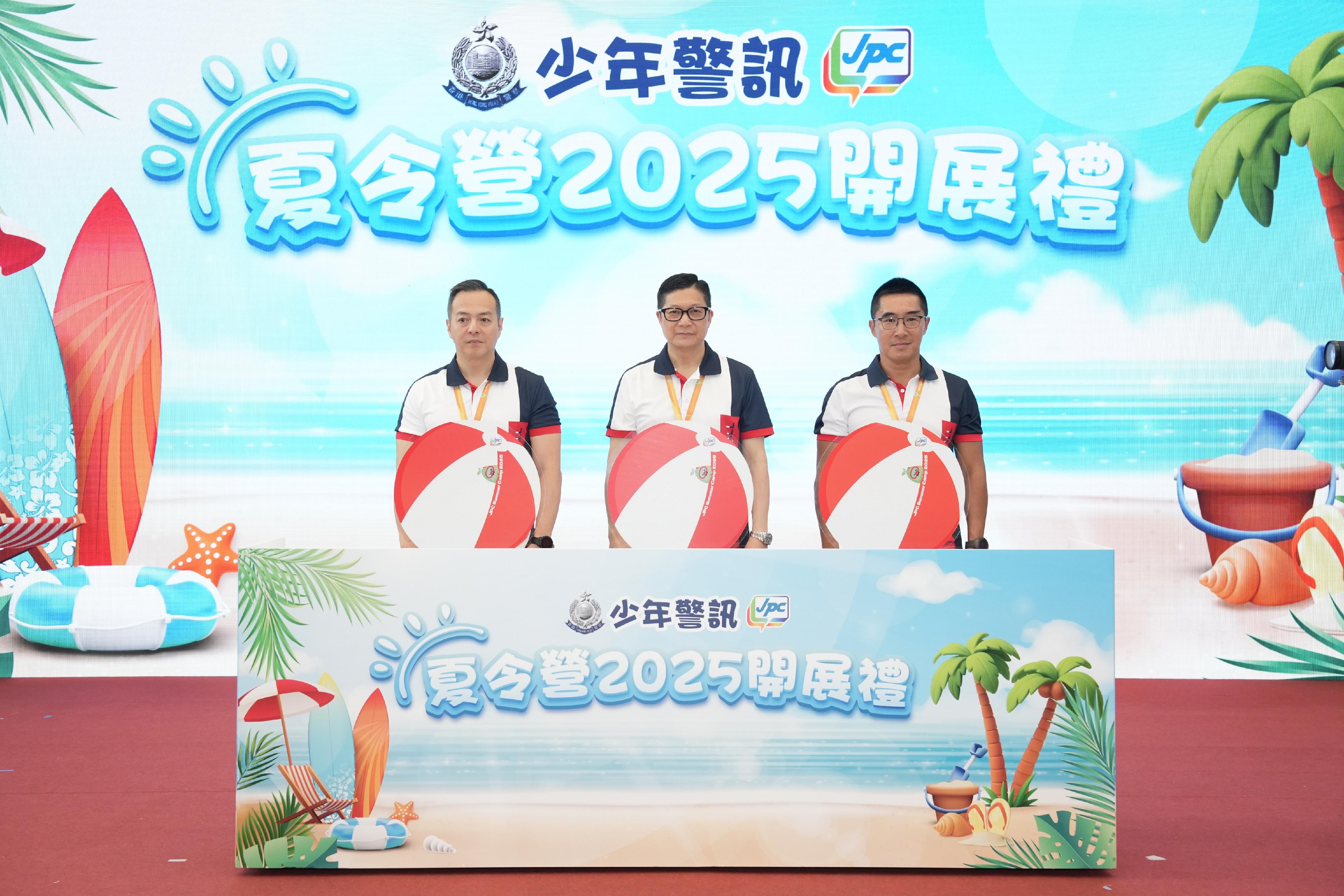 保安局局長暨少年警訊(少訊)總名譽會長鄧炳強、警務處處長暨少訊副總名譽會長周一鳴,以及警務處助理處長(公共關係)暨少訊中央諮詢委員會主席陳思達,於八月二十日在八鄉少訊永久活動中心主持「少年警訊夏令營2025」開展禮。
