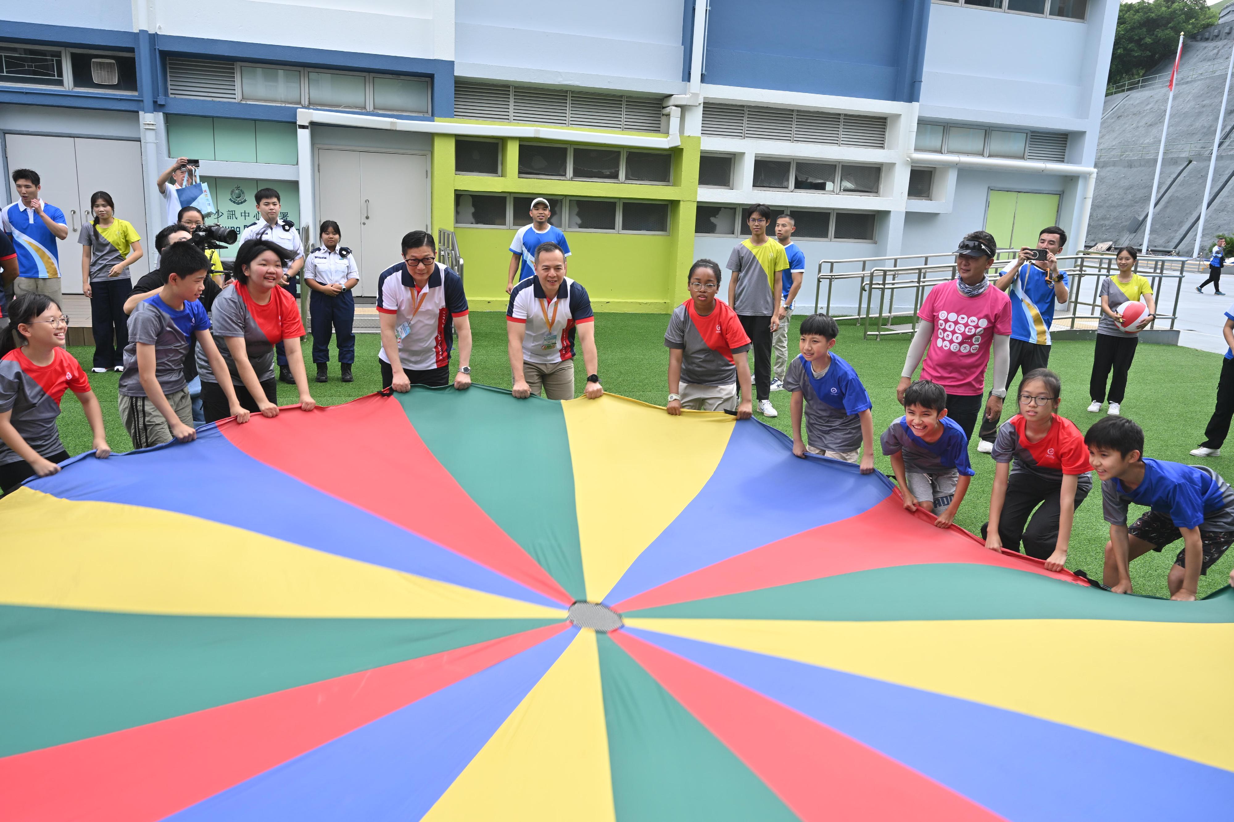 開展禮後,鄧炳強與一眾嘉賓參觀警務處毒品調查科設置的攤位,以及場內的繩網陣、緣繩下降等活動設施,並與少訊會員交流。