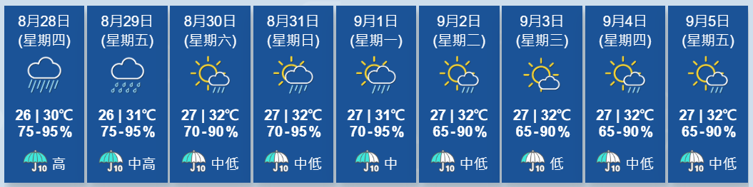 天文台表示,在該低壓系統與中國東南部的高壓脊共同影響下,並會在明日(28日)影響珠江口一帶,預計本港明日有驟雨、雷暴及狂風,明早及日間雨勢有時頗大。