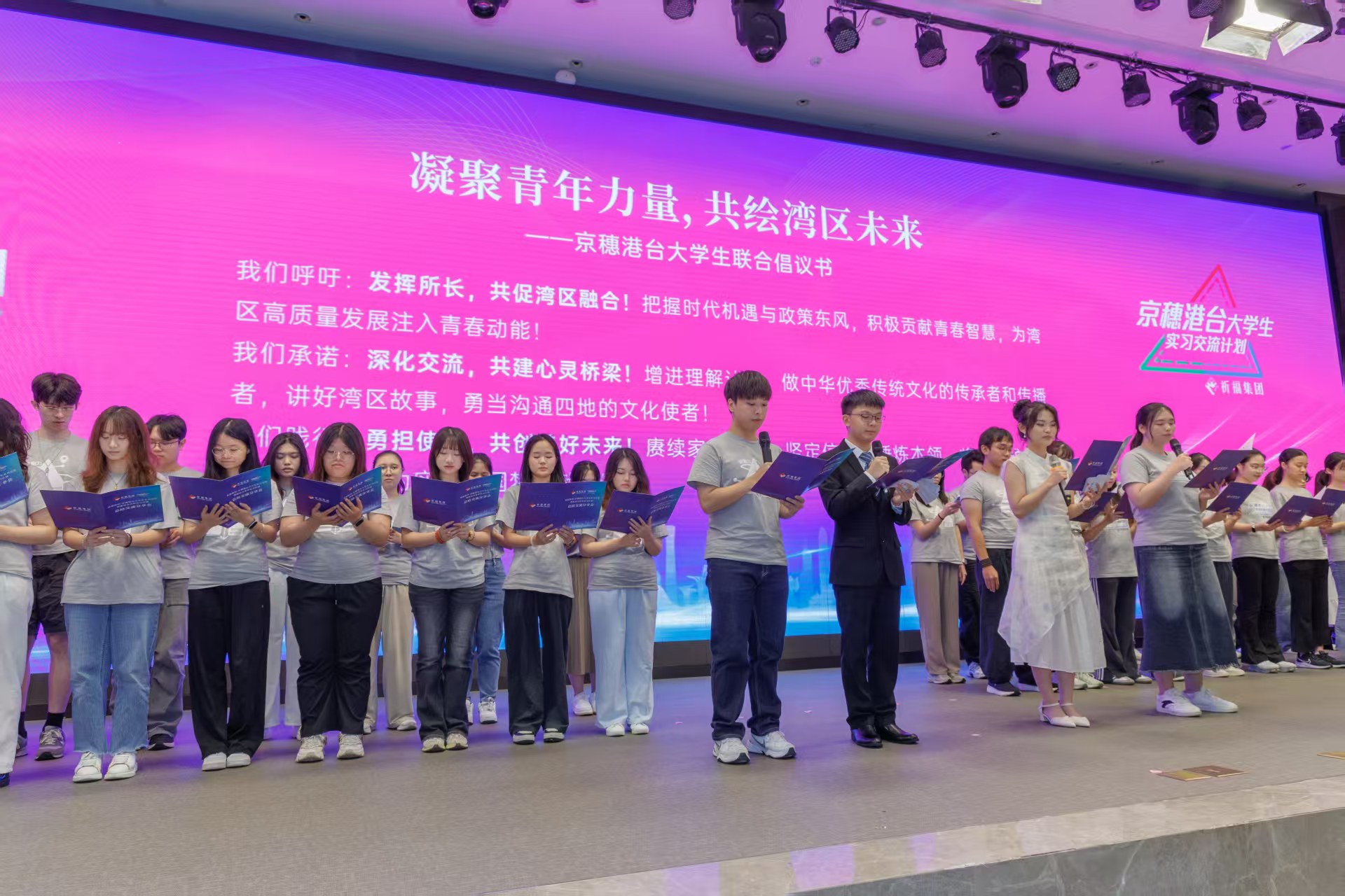 當晚,京穗港台四地學子共同宣讀《凝聚青年力量,共繪灣區未來》倡議書。「攜手同心融入灣區大局,各展所長共促融合發展……」香港學生陳薇茵分享暑期在祈福護老公寓的實習見聞:該機構積極構建老有所養、老有所醫、老有所樂的幸福圖景,令她對長者評估規範、常見病診療及護理實務有了深度認知。於祈福醫院醫護部實習的王文陞則習得火龍灸、懸空灸及裂隙燈顯微鏡等實用技能,更與室友共烹廣式靚湯,分享美食溫情。