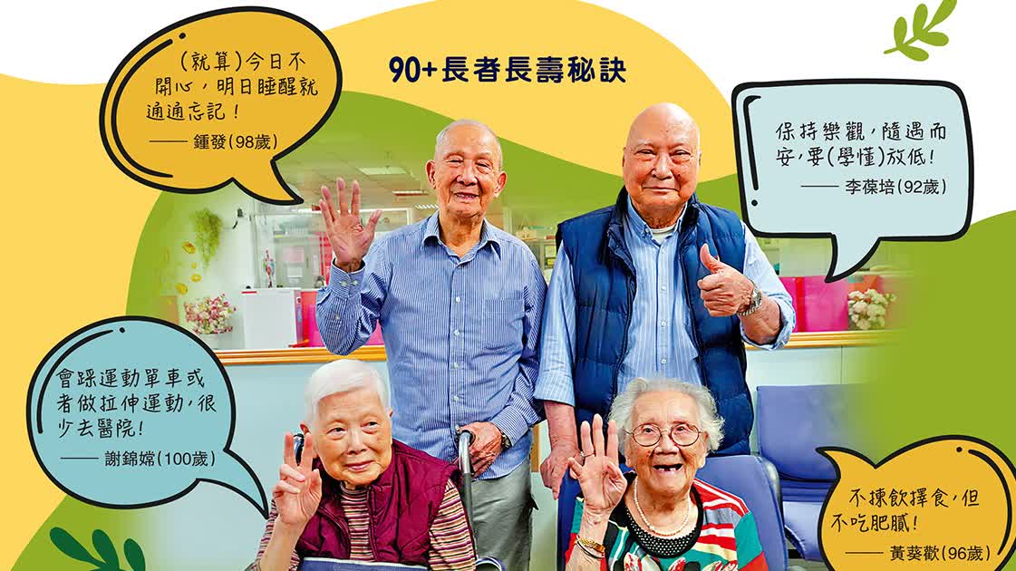 住在土瓜灣一間護老院的四位長者,鍾發、李葆培、黃葵歡、謝錦嫦,年齡介乎92至100歲,個個活得健康,「日日食得又瞓得」。當中「最年輕」、92歲的李葆培受訪時中氣十足,他笑言長壽秘訣是「保持樂觀,隨遇而安,要(學懂)放低!」李伯長期保持心境開朗,而且習慣做適量運動。最年長的謝錦嫦婆婆已年屆100歲,除了聽力較差,身體狀況良好,她表示,平日習慣做伸展運動,除了定期覆診,甚少因病要到醫院求醫。