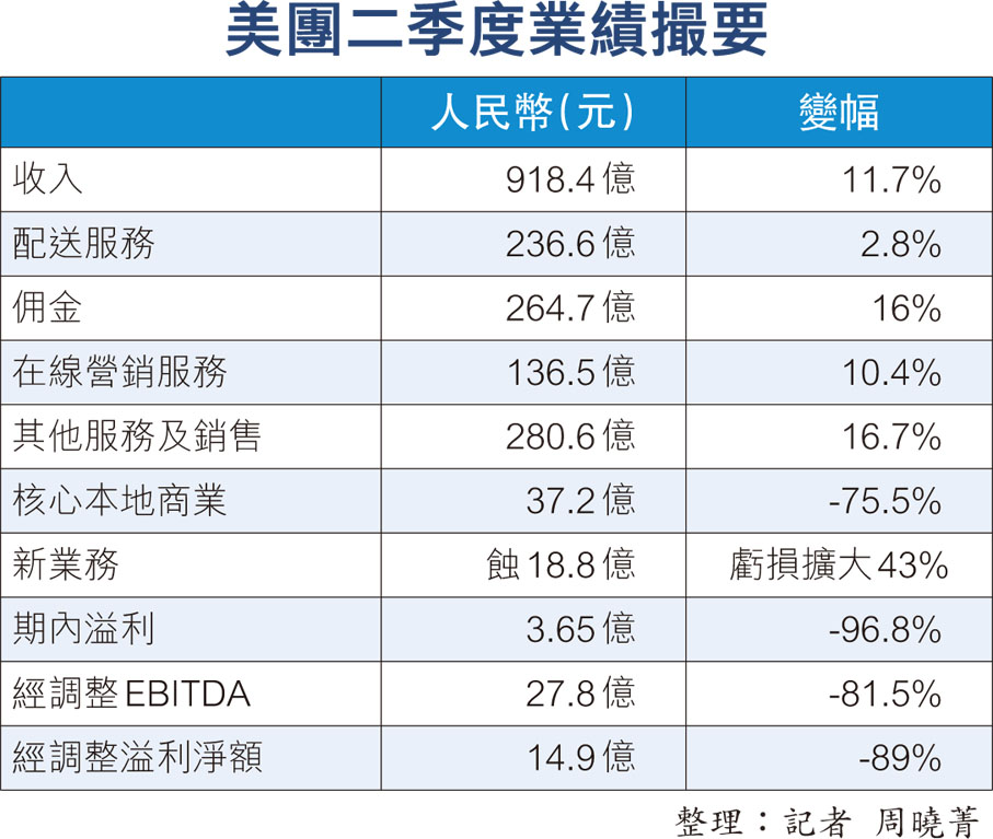 (香港文匯報記者 周曉菁)內地外賣市場戰火難分難解,這場歷時已久的激戰,隨着各「參賽者」公布中期業績,即將分出高下。美團(3690)昨公布次季業績,收入同比增長11.7%至918.4億元(人民幣,下同),經調整溢利淨額按年大幅減少89%至14.9億元,環比第一季亦有86%的縮水,遠遜於市場預期。首席執行官兼董事長王興在電話業績會上表示,餐飲外賣和即時零售行業競爭加劇,其他平台的補貼仍處於高位,美團也會實時調整策略應對競爭,料第三季度核心本地商業仍會錄得較大虧損。