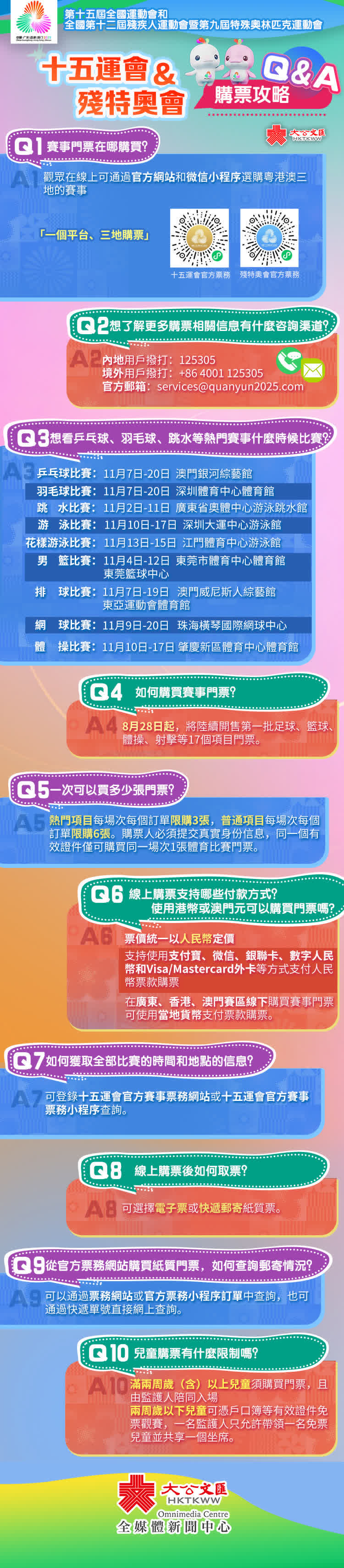 香港賽區共有11個售票項目,包括十五運會8個競賽項目和全國第十二屆殘疾人運動會暨第九屆特殊奧林匹克運動會(殘特奧會)3個競賽項目。其餘比賽項目門票計劃在9月下旬和10月上旬,根據競賽賽程分階段、批次發售。