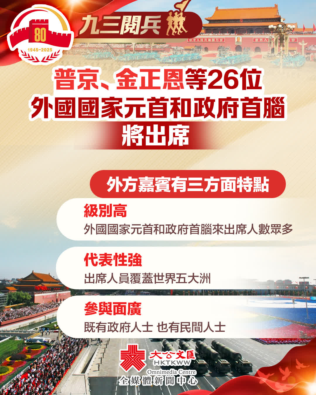 外交部部長助理洪磊介紹,應中國國家主席習近平邀請,26位外國國家元首和政府首腦將出席中國人民抗日戰爭暨世界反法西斯戰爭勝利80周年紀念活動。他們是:俄羅斯總統普京,朝鮮勞動黨總書記、國務委員長金正恩,柬埔寨國王西哈莫尼,越南國家主席梁強,老撾人民革命黨中央委員會總書記、國家主席通倫,印度尼西亞總統普拉博沃,馬來西亞總理安瓦爾,蒙古國總統呼日勒蘇赫,巴基斯坦總理夏巴茲,尼泊爾總理奧利,馬爾代夫總統穆伊茲,哈薩克斯坦總統托卡耶夫,烏茲別克斯坦總統米爾濟約耶夫,塔吉克斯坦總統拉赫蒙,吉爾吉斯斯坦總統扎帕羅夫,土庫曼斯坦總統謝爾達爾·別爾德穆哈梅多夫,白俄羅斯總統盧卡申科,阿塞拜疆總統阿利耶夫,亞美尼亞總理帕什尼揚,伊朗總統佩澤希齊揚,剛果(布)總統薩蘇,津巴布韋總統姆南加古瓦,塞爾維亞總統武契奇,斯洛伐克總理菲佐,古巴共產黨中央第一書記、國家主席迪亞斯-卡內爾,緬甸代總統敏昂萊。
