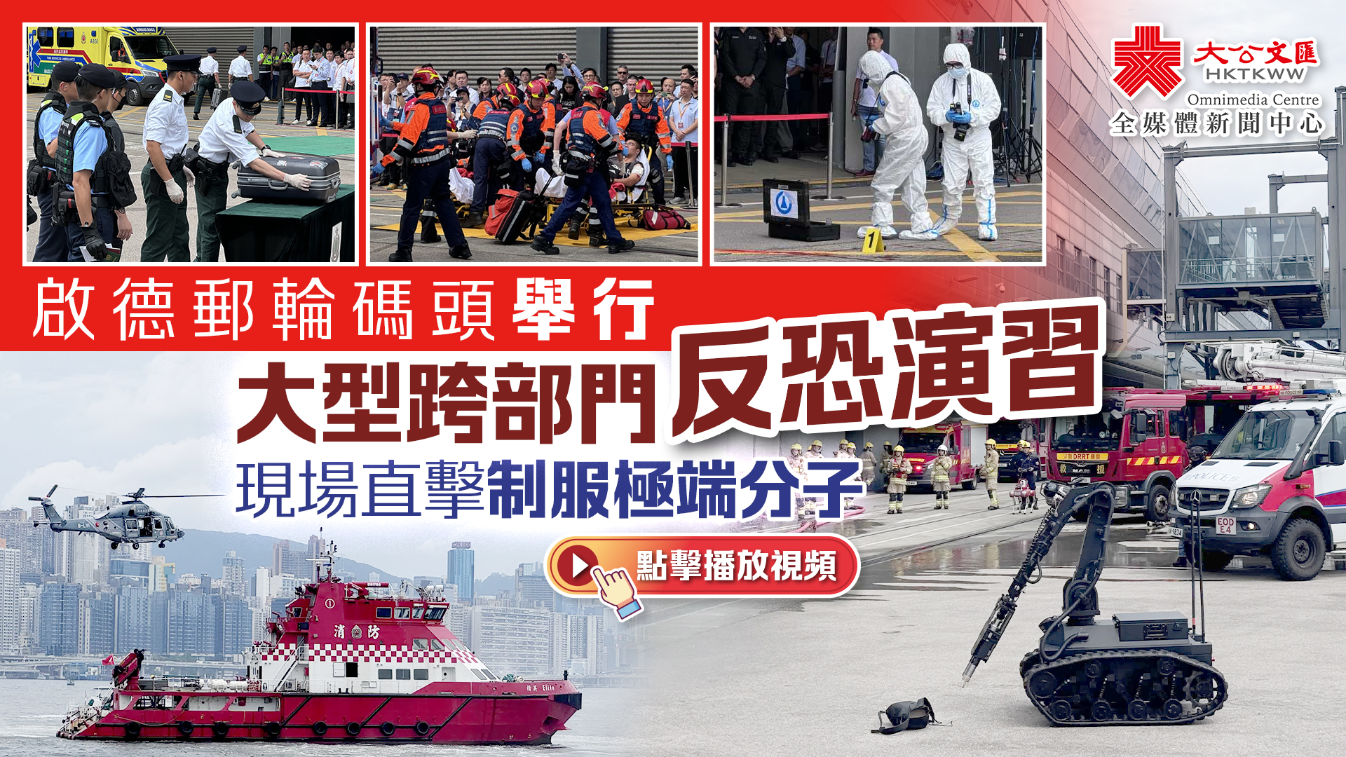 (大公文匯全媒體 記者 梁譯尹)跨部門反恐專責組今日(8月28日)下午在啟德郵輪碼頭進行代號「勇光」的跨部門反恐演習。