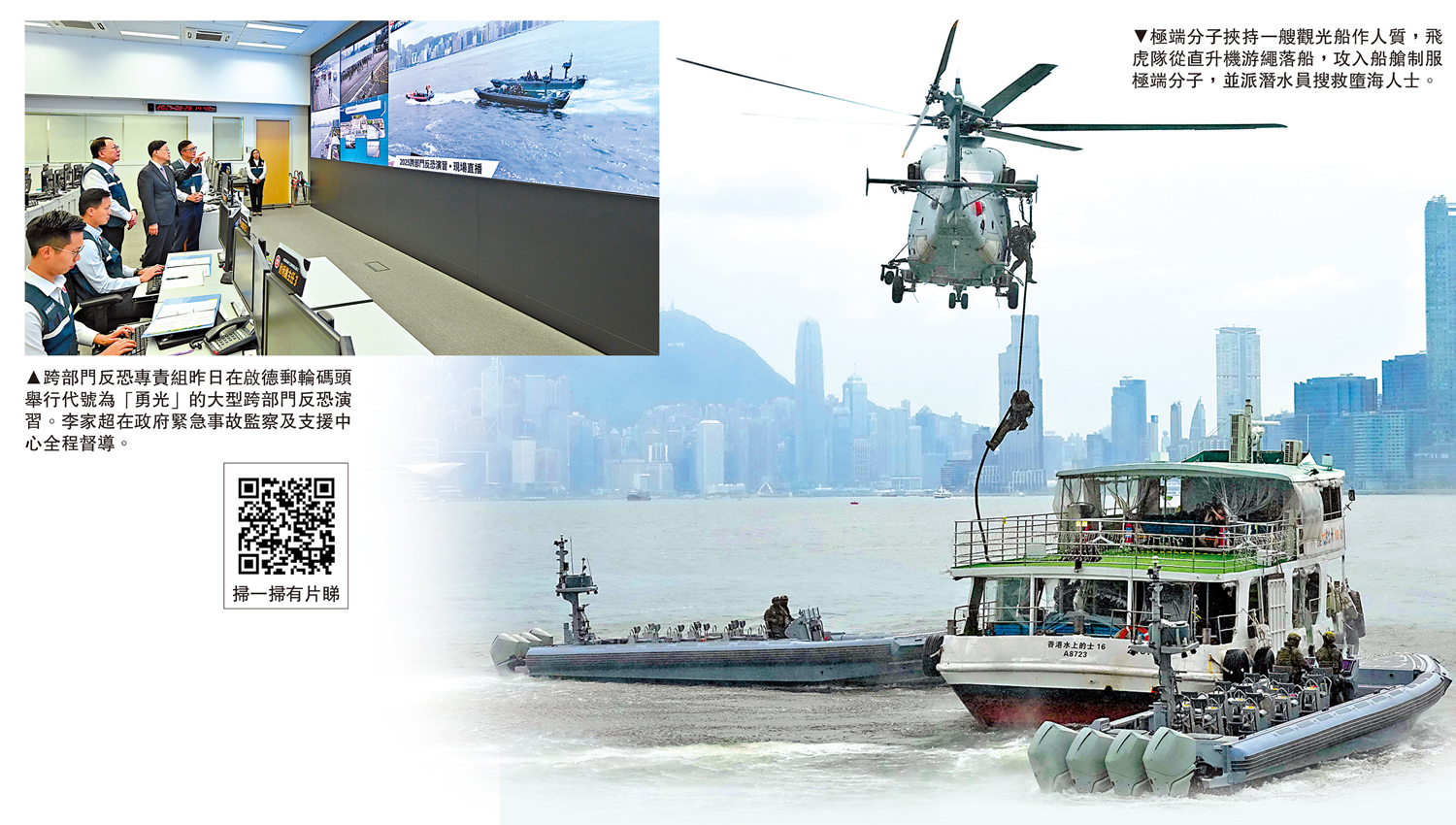 反恐已上升為政府核心議程。跨部門反恐專責組昨日於啟德郵輪碼頭,舉行代號為「勇光」的首次大型跨部門反恐演習。特首李家超、政務司司長及保安局局長親自監督演習,更首次啟動政府緊急事故監察及支援中心,測試不同部門在突發恐怖襲擊中的應變及協作能力。