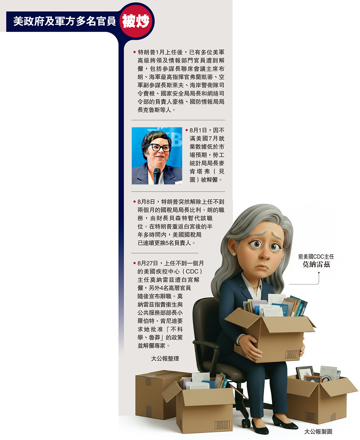 因不滿美國7月就業數據低於市場預期,特朗普解僱了勞工統計局局長麥肯塔弗,並指控她「出於政治目的操縱就業數據」。五角大樓國防情報局此前發布伊朗核設施遭破壞情況的初步報告,與特朗普聲稱「完全被摧毀」的說法不一致,國防情報局局長克魯斯也被解職。