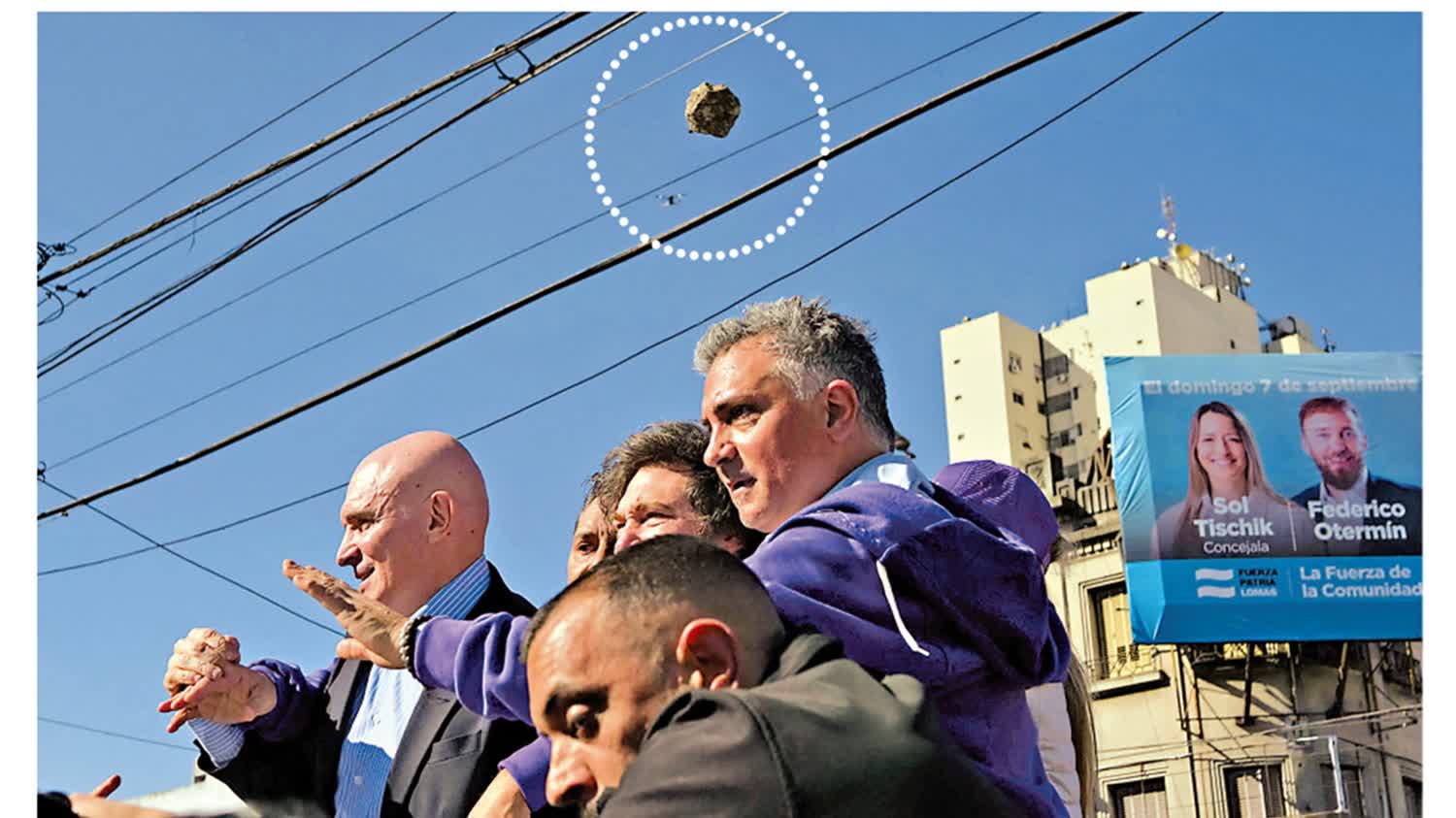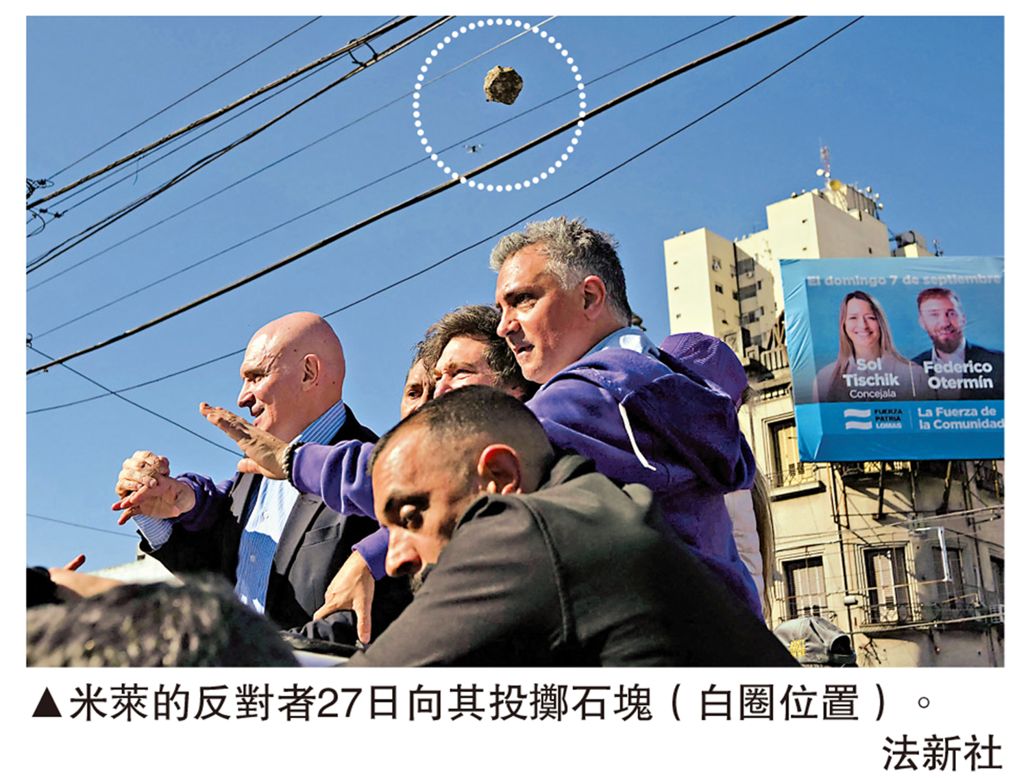 大公報綜合BBC、路透社報道,阿根廷總統米萊27日在布宜諾斯艾利斯省參加助選活動時遭民眾投擲石塊,不得不在安保人員護送下撤離。米萊的發言人表示其未受傷。此次事件不僅中斷了活動,更在阿根廷地方選舉及議會中期選舉前加劇了緊張局勢。