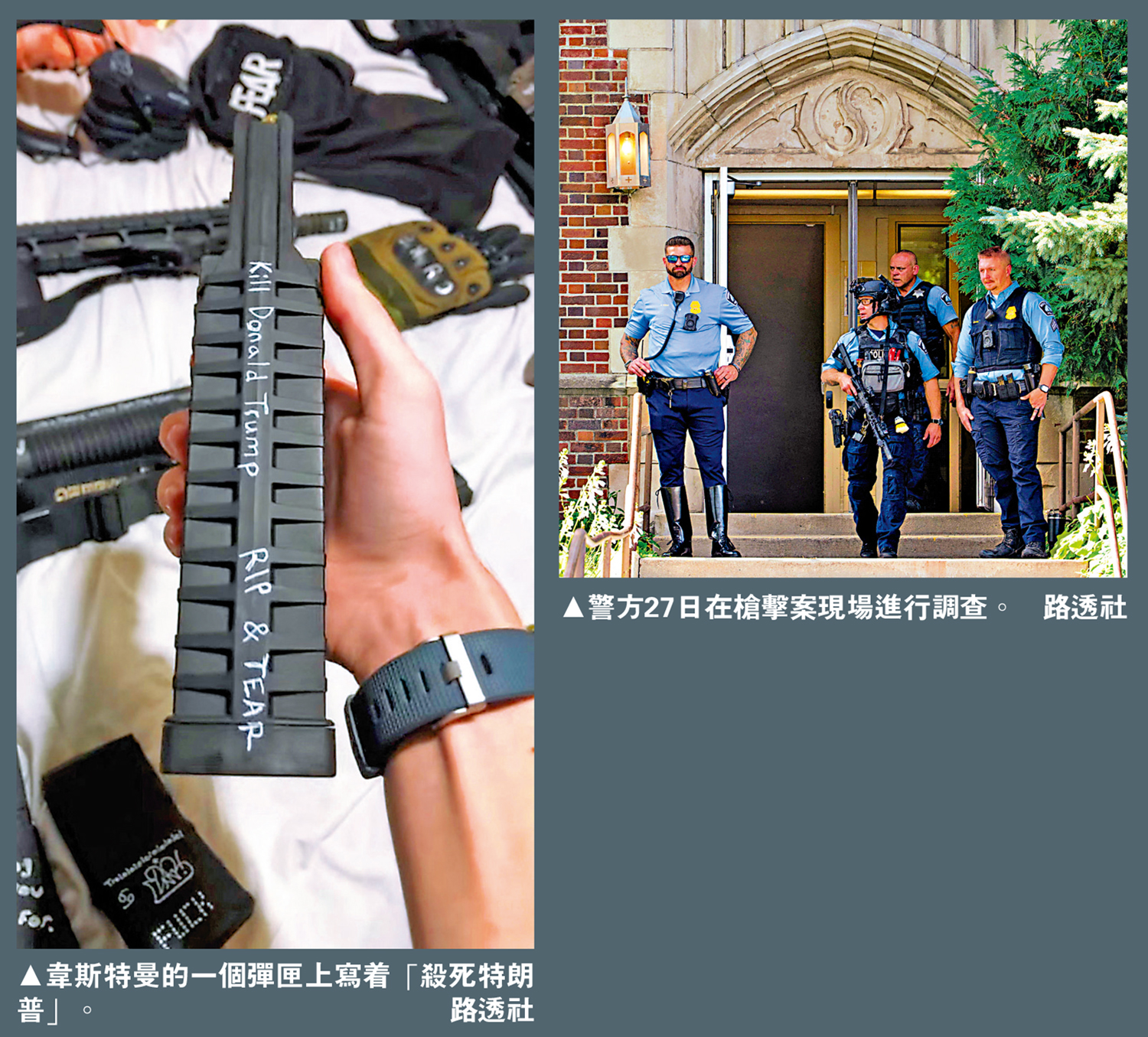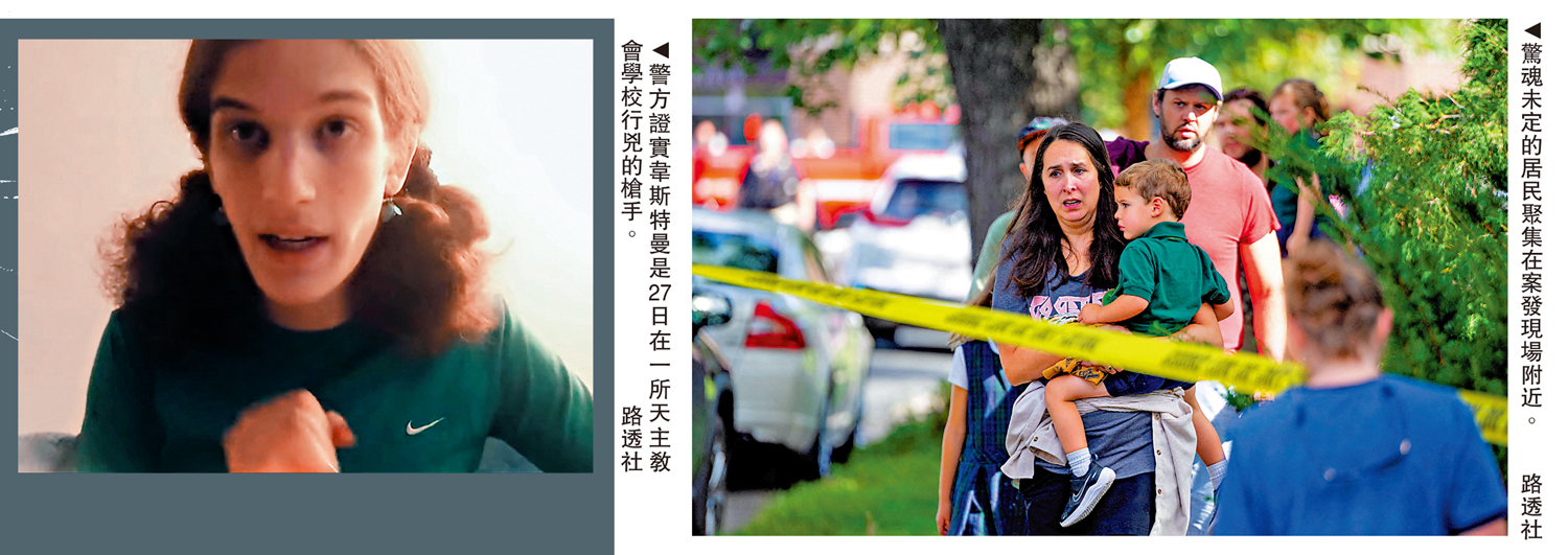 大公報綜合報道,美國明尼蘇達州明尼阿波利斯市一所天主教會學校27日發生槍擊案,槍手殺害2名兒童、打傷另外14名兒童和3名老人後飲彈自盡。警方確認槍手為23歲的跨性別人士羅賓·韋斯特曼,其具體動機尚不清楚,聯邦調查局(FBI)目前正按照本土恐怖主義和仇恨犯罪方向展開調查。韋斯特曼曾在YouTube上發布視頻,展示自己的武器,上面寫着「殺死特朗普」、種族歧視及反天主教標語,以及多名槍手的名字。