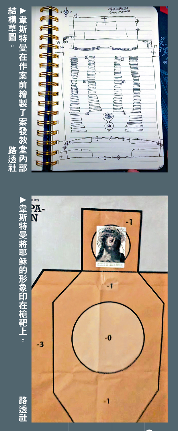 韋斯特曼稱,發動襲擊並不是因為種族主義或白人至上主義,並表示自己「病了」。其日記本裏寫着大量涉及暴力和自我厭惡的言論。文字既有英文段落,也有用西里爾字母拼出的英文詞句和零星俄語。