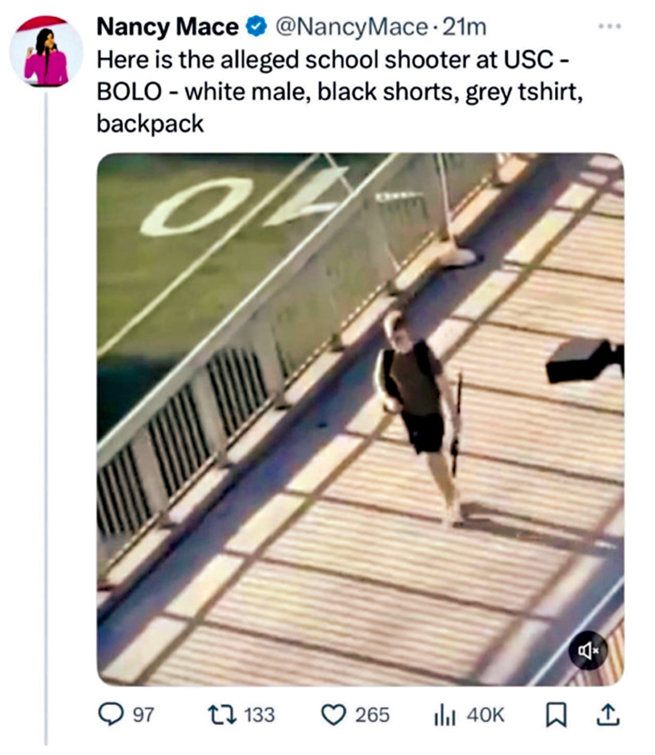 假消息頻繁觸發應急部門響應,導致建築封鎖、人員疏散。在南卡羅來納大學,兩名學生匆忙撤離時受輕傷。共和黨籍聯邦眾議員梅斯的孩子是該校學生,梅斯在社交媒體上發布一名男子手持雨傘的照片,錯誤地聲稱這是「槍手」,引發更多混亂。在校園槍擊案中痛失愛女的控槍活動人士古滕伯格批評梅斯發布不實信息,並要求追究她的責任。