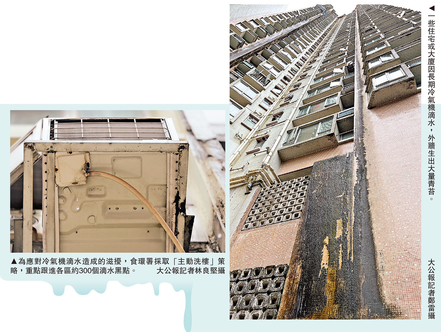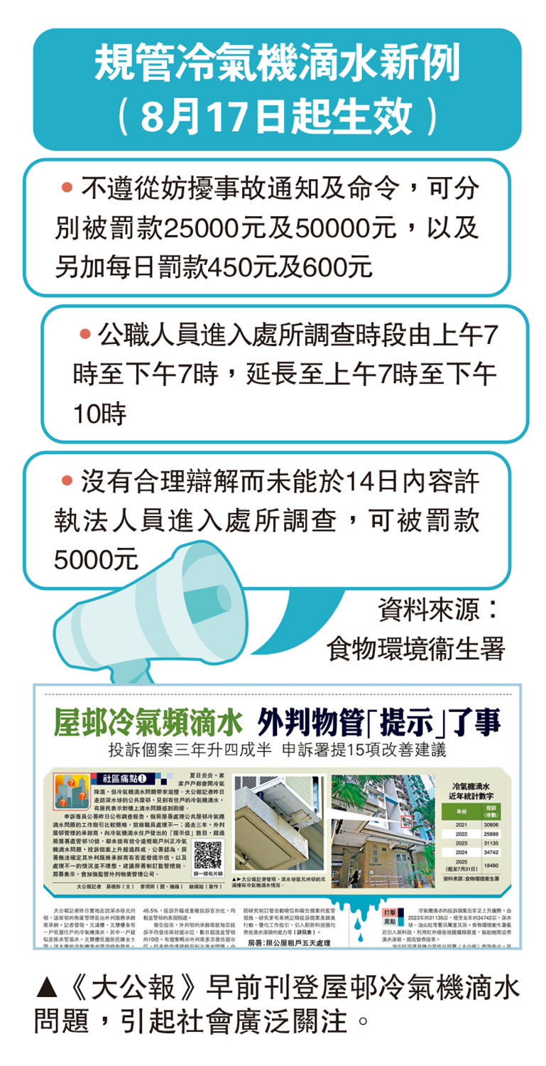 為應對夏季冷氣機滴水造成的滋擾,食環署今年5月起採取「主動洗樓」策略,重點跟進各區約300個滴水黑點,包括巴士站、小巴站候車點等30個影響較大的黑點,同時引入紅外線夜視技術,幫助夜間亦能快速識別滴水源頭,大幅削減調查取證時間,便利執法。