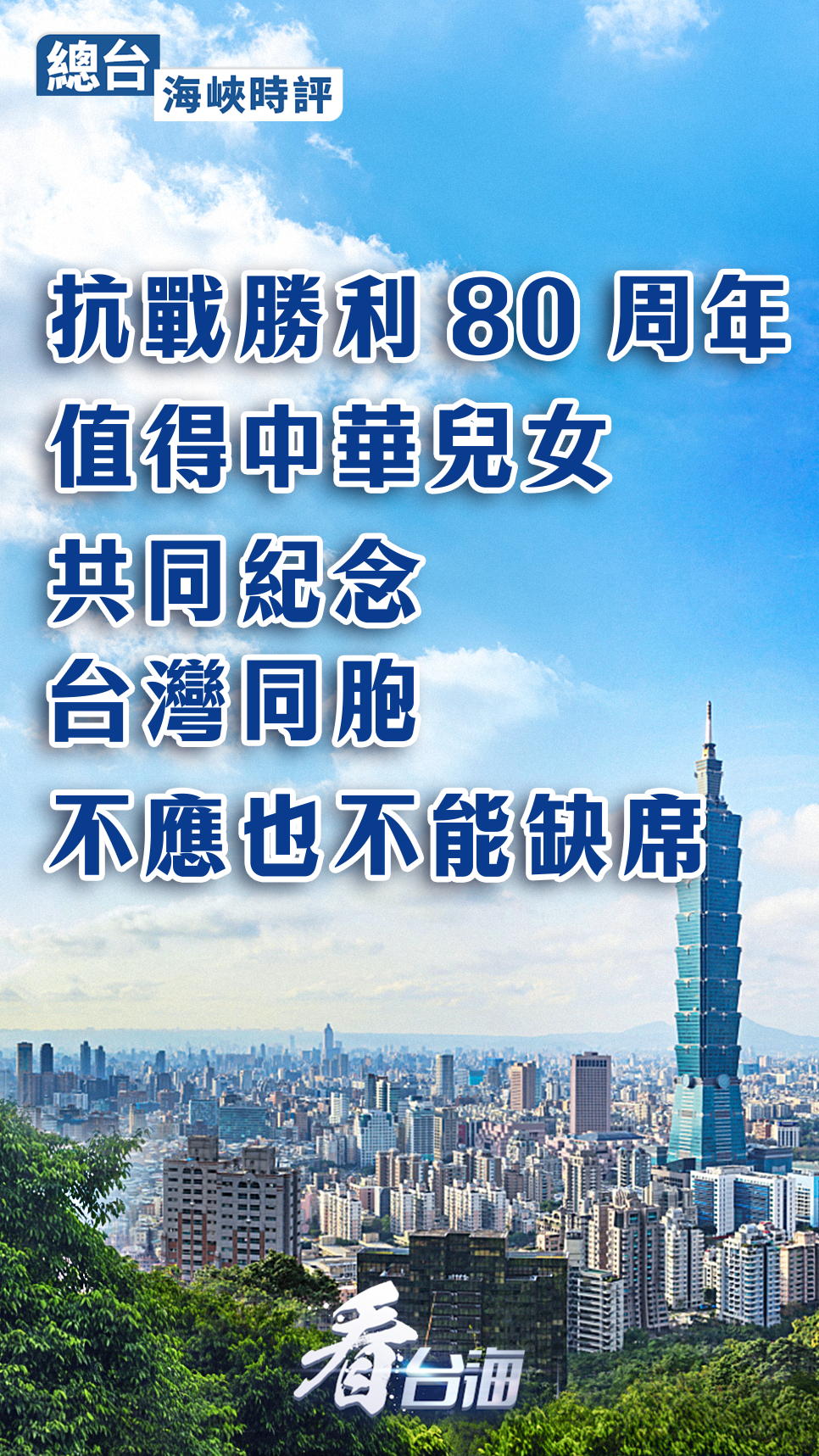 抗日戰爭是全民族譜寫的壯麗史詩,紀念抗戰勝利是兩岸共同的民心所向。80年前,兩岸同胞共同捍衛了國家主權和領土完整;80年後,廣大台灣同胞也應傳承光榮的愛國主義傳統,堅持正確的歷史觀、民族觀、國家觀,堅決反對「台獨」分裂,與大陸同胞一道,共同追求祖國統一與民族復興的美好未來。