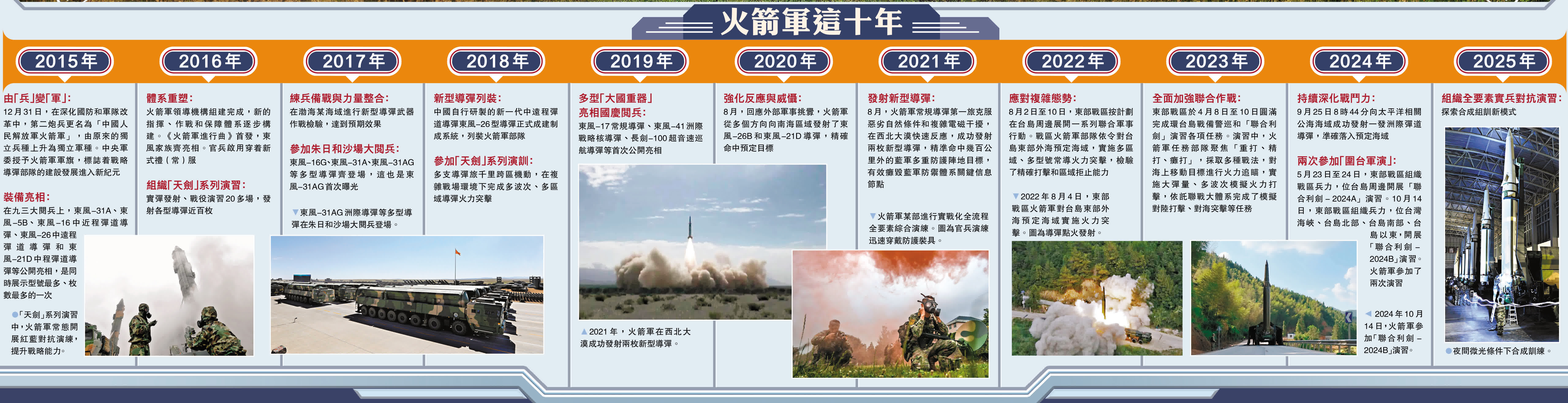 (香港文匯報記者 馬靜)作為戰略威懾的核心力量,火箭軍是維護國家安全的重要基石。十年間,從第二炮兵到火箭軍的跨越轉型,由「兵」變「軍」,無論是武器裝備,還是戰略打擊能力,都實現質的飛躍。