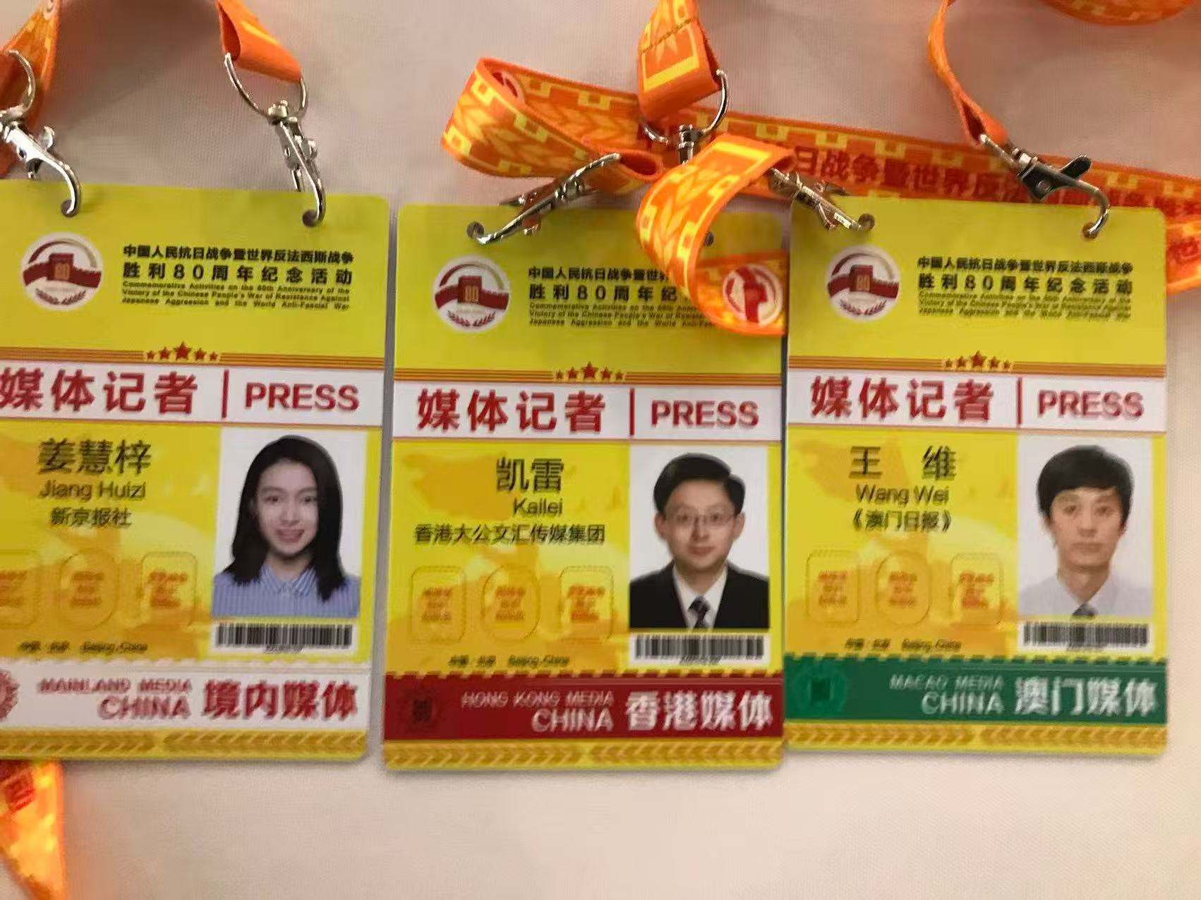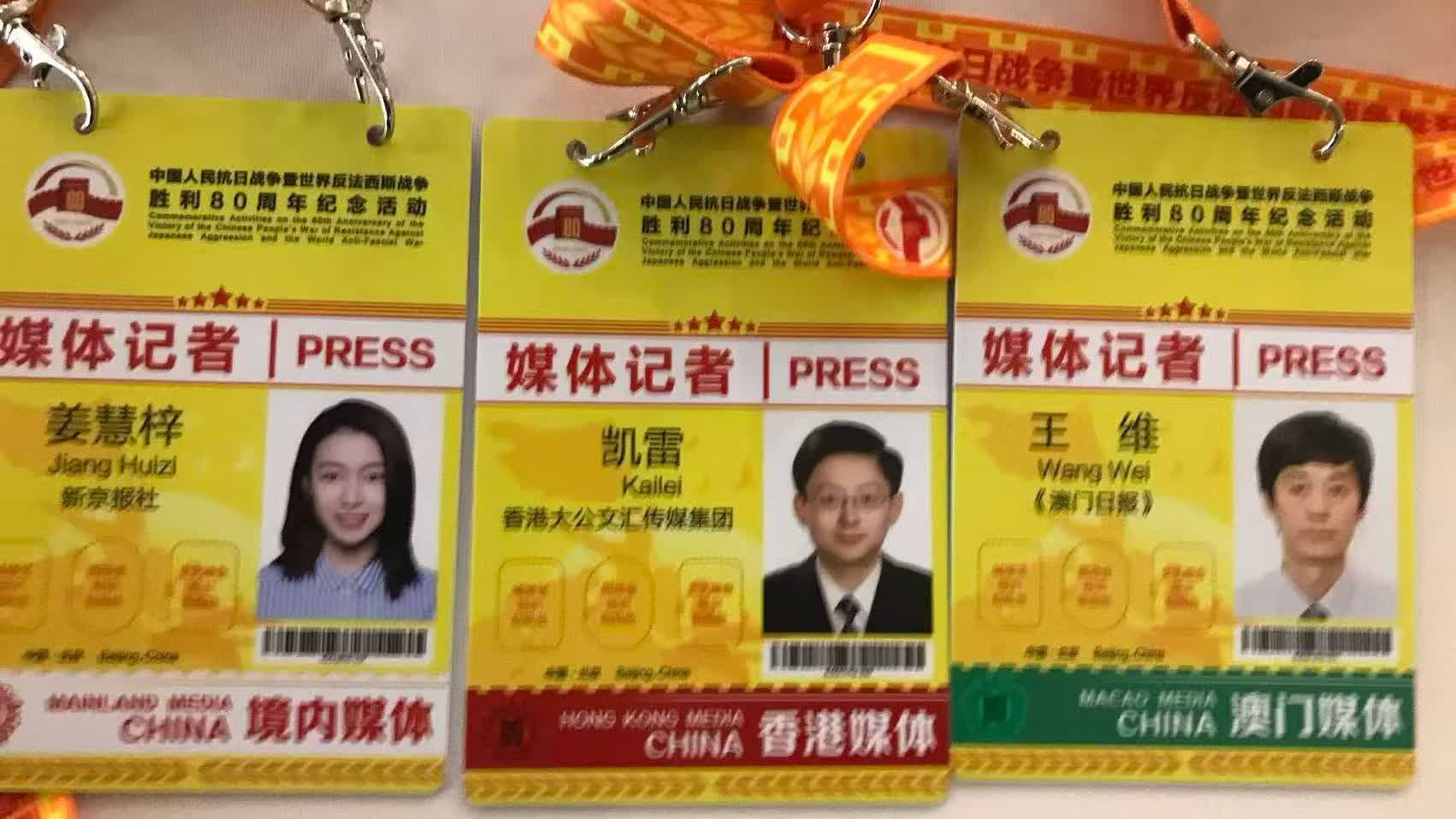(大公文匯網記者 郭瀚林、凱雷 北京報道)27日一早,本報記者搶得「頭啖湯」,第一個來到北京梅地亞中心的新聞中心探訪,第一個領取到「中國人民抗日戰爭暨世界反法西斯戰爭勝利80周年紀念活動」記者證,這枚證件以明亮的黃色為底,整體設計簡潔大氣。記者留意到,此次證件上的「粘貼」標識透露重要信息,即中外媒體共有三場重要活動,即「招待會」、「文藝晚會」、「城樓區」報道。值得注意的是,與內地記者證的「白」,澳門記者證「綠」不同,香港記者證件的底部橫幅欄採用的是與活動標識同款的紅色,顯得尤為協調美觀。