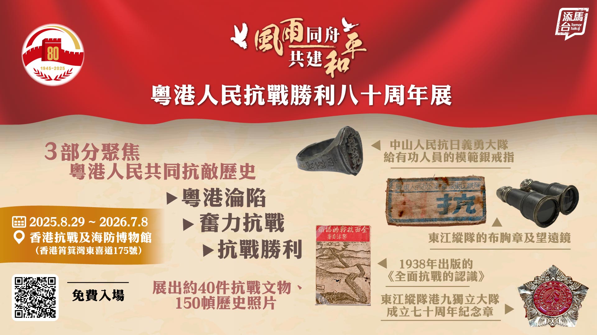 為紀念中國人民抗日戰爭暨世界反法西斯戰爭勝利八十周年,香港抗戰及海防博物館推出「風雨同舟 共建和平——粵港人民抗戰勝利八十周年展」,聚焦面對外敵入侵時,廣東及香港兩地人民在中國共產黨的領導下,血脈相連、團結一心、共同抗敵的歷史,展期至明年7月8日,免費入場。